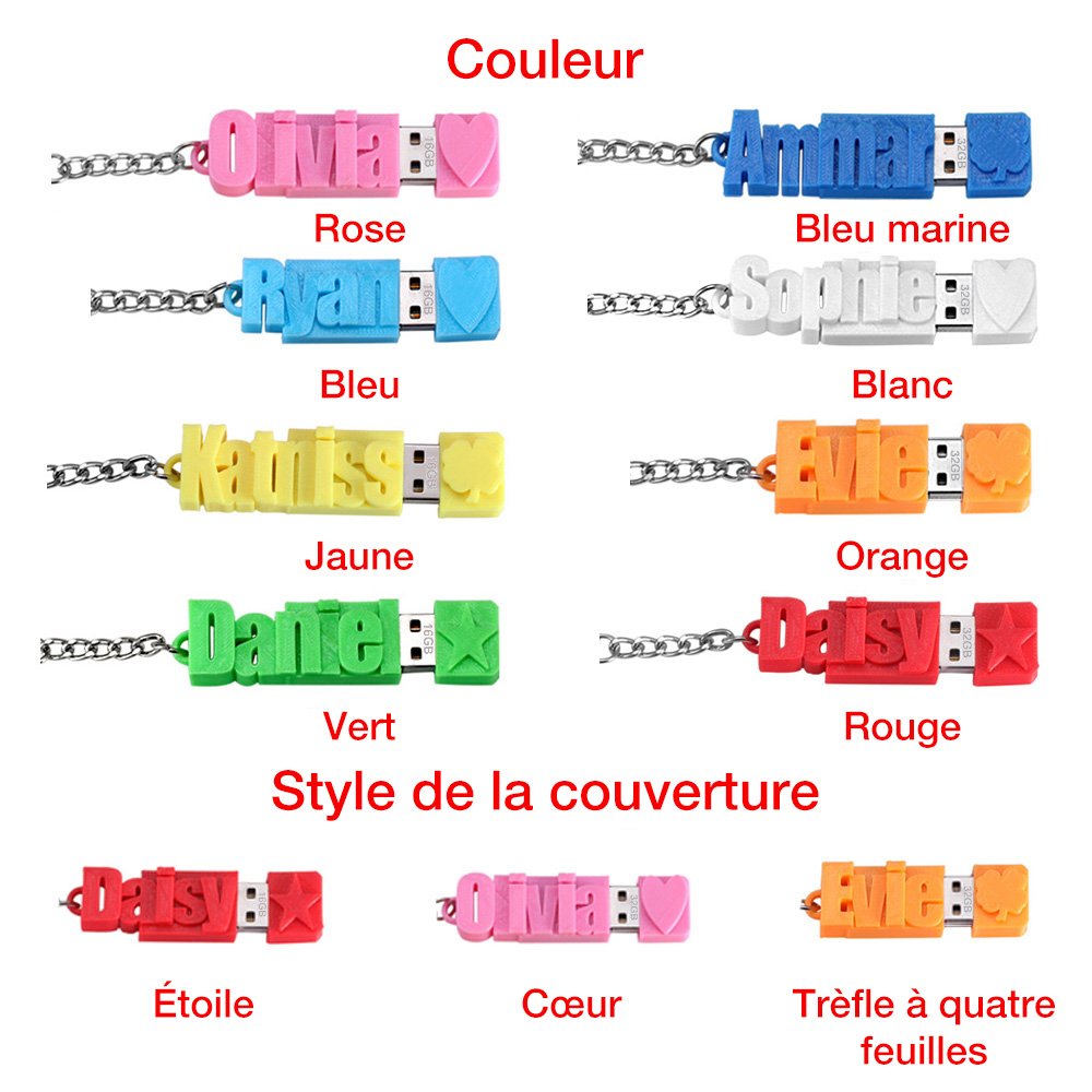 • Clé USB créative et amusante pour les personnes qui utilisent souvent l'outil dans un bureau ou à d'autres occasions, et qui prennent toujours à tort celle des autres pour la sienne ou qui oublient souvent où se trouve la clé USB. La clé USB résoudra parfaitement le problème par son aspect coloré et son prénom personnalisé par vous-même.