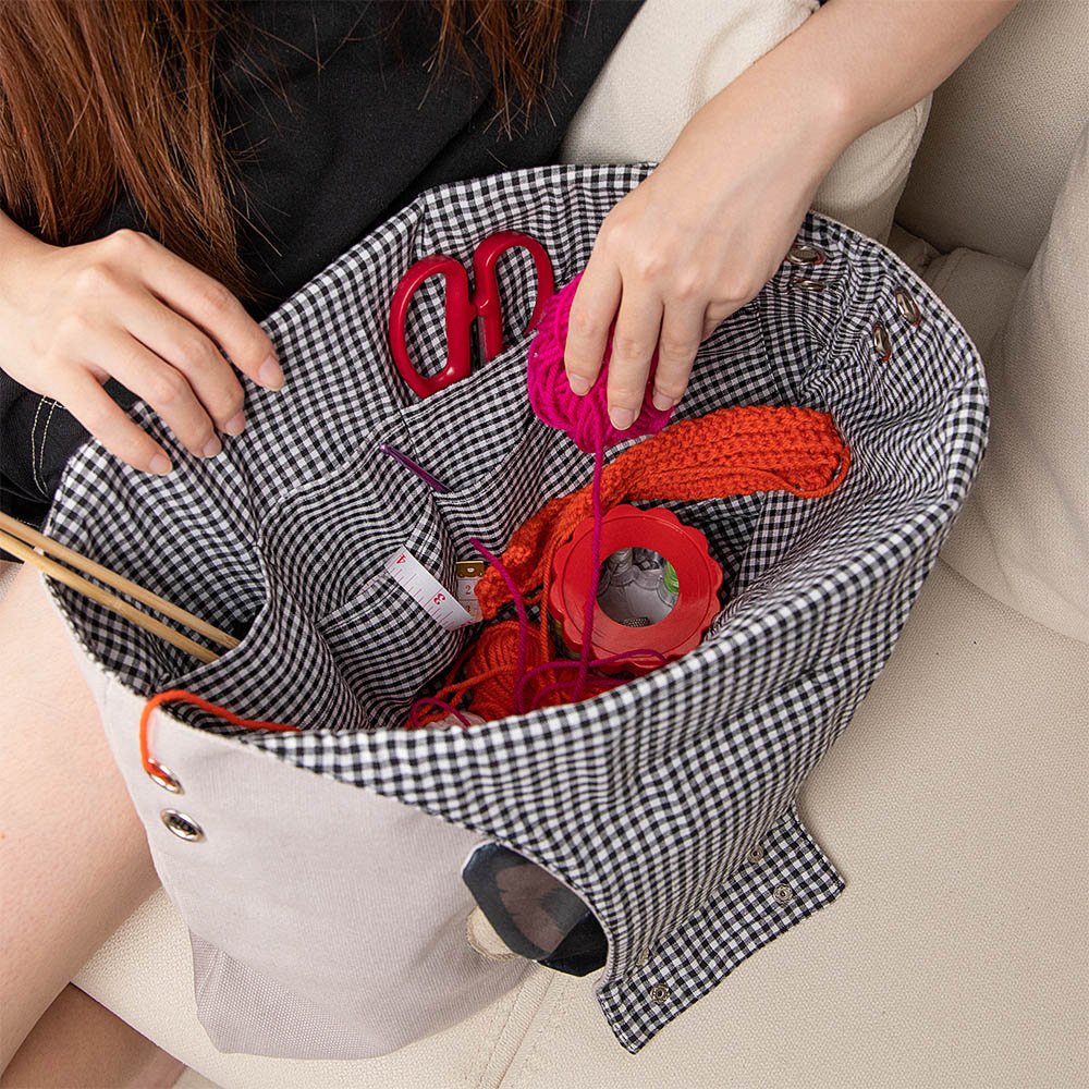 Ce sac toile rangement laine marie deux passions : chats et tricot. Design chat mignon, pochette détachable, toile robuste. Organisation pelotes aiguilles.