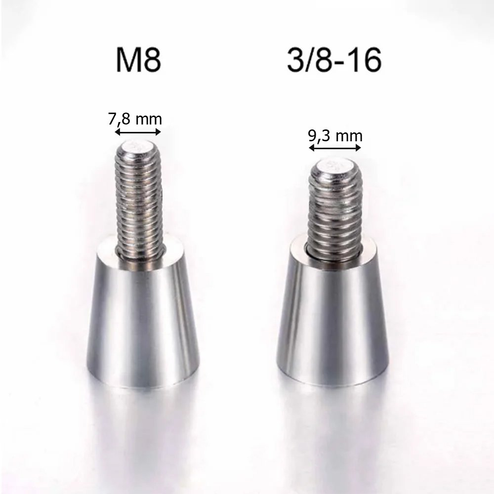 Nos tarauds sont dotés d'un filetage femelle disponible en deux tailles : 3/8-16 et M8. Veillez à ce que votre robinet corresponde à la taille sélectionnée afin qu'il soit parfaitement adapté.
