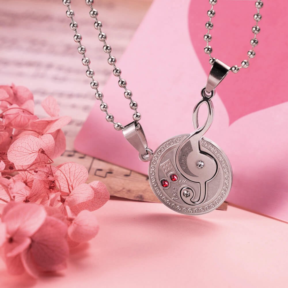 • Conçu pour les couples mélomanes. Collier séparé en deux parties et uni en un seul disque. Note de musique incrustée sur le disque, signifiant les deux amoureux ensemble pour toujours. Deux pierres de naissance scintillantes sur le disque soulignant l'unicité du collier.
