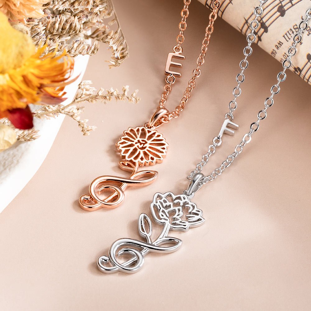 Collier à Personnalisé avec Initiale et Fleur de Naissance Pendentif avec Fleur et Notation Musicale Cadeau Anniversaire Fête des Mères pour Maman