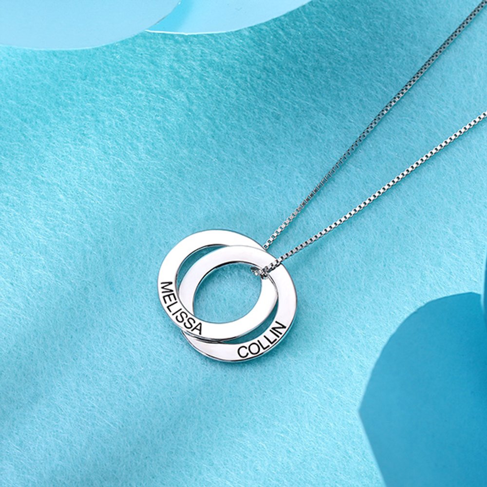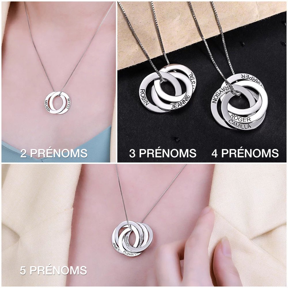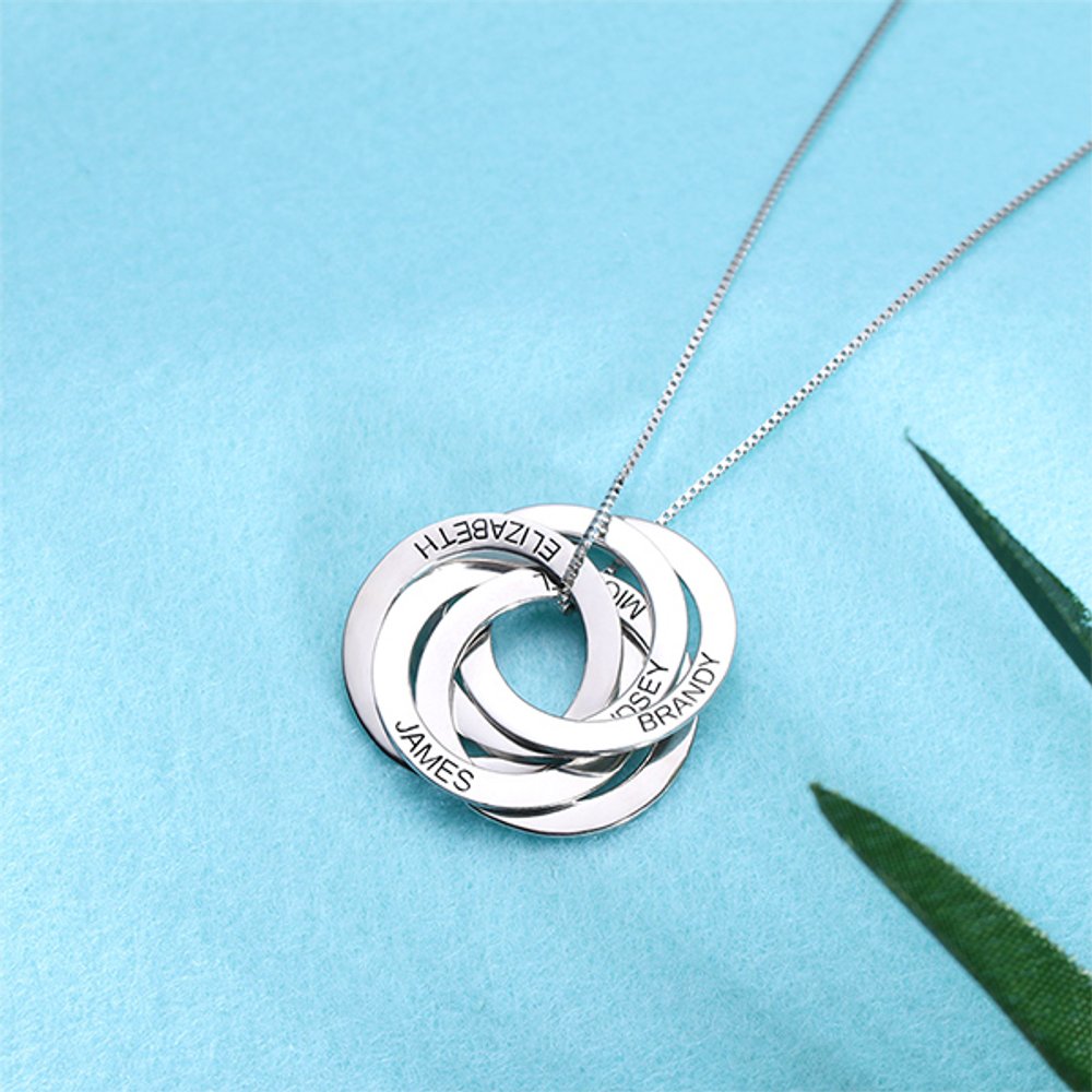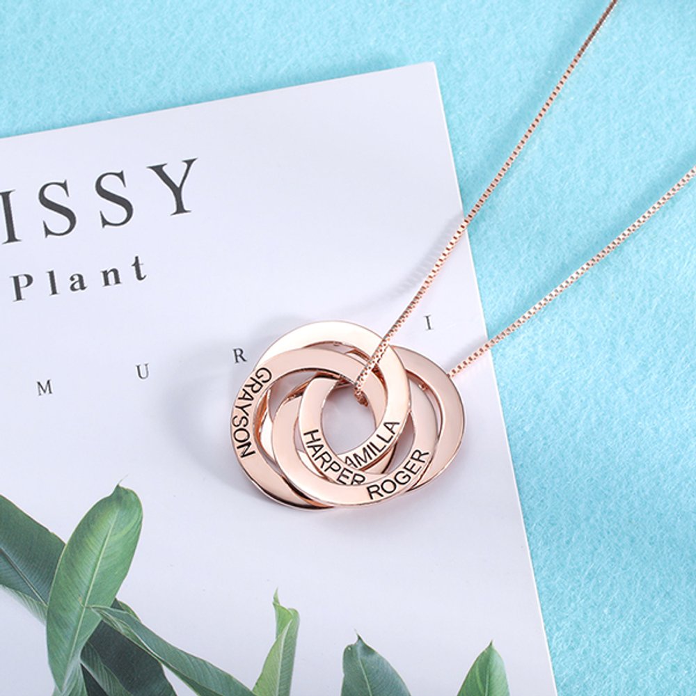 [La pièce maîtresse de ce collier est le pendentif en forme d'anneau russe imbriqué, qui symbolise les liens indéfectibles de l'amour, de la famille et de l'amitié. Chaque anneau représente un individu unique et, une fois combinés, ils créent un ensemble magnifique et harmonieux. L'emboîtement signifie l'interconnexion et l'unité de ceux qui sont gravés sur le pendentif.