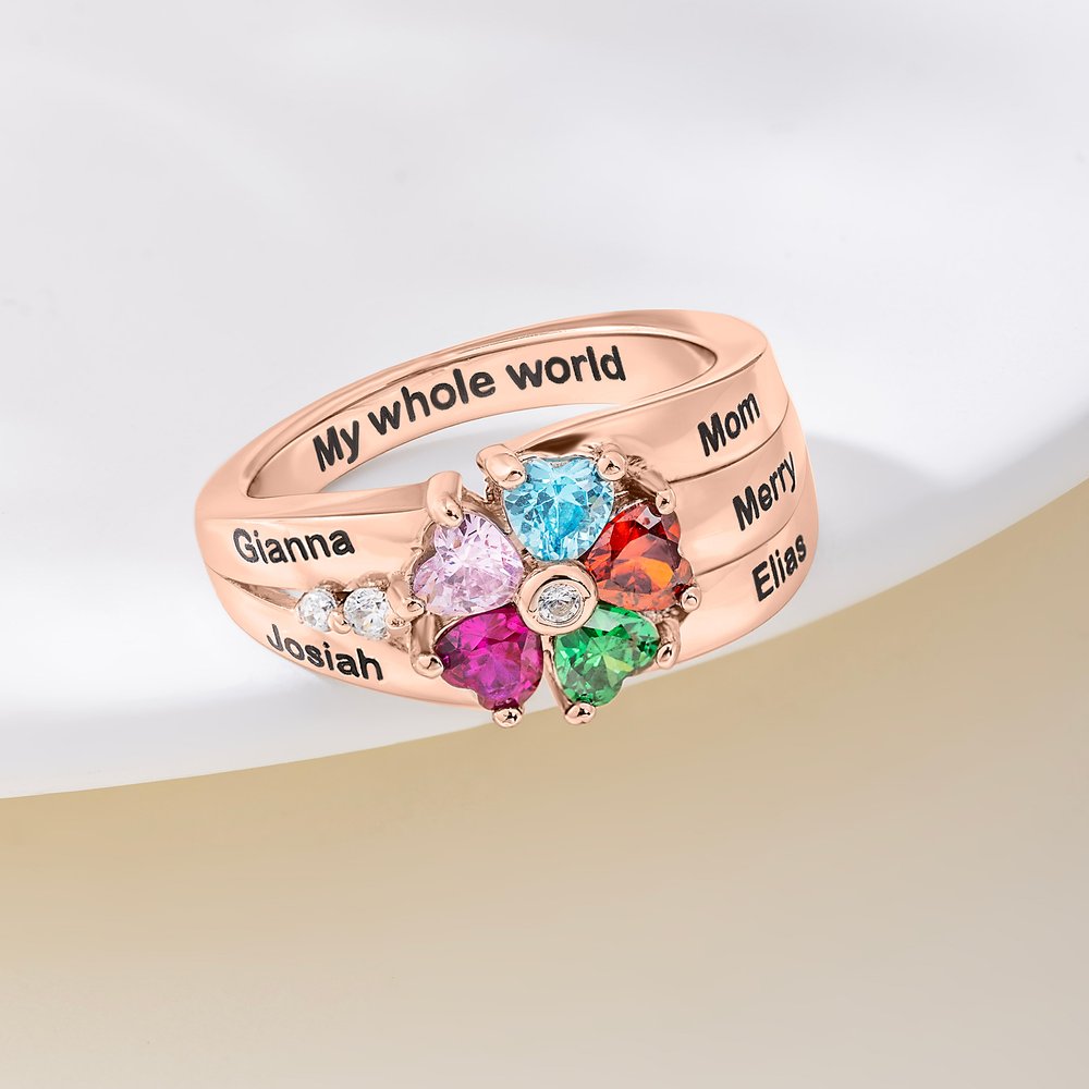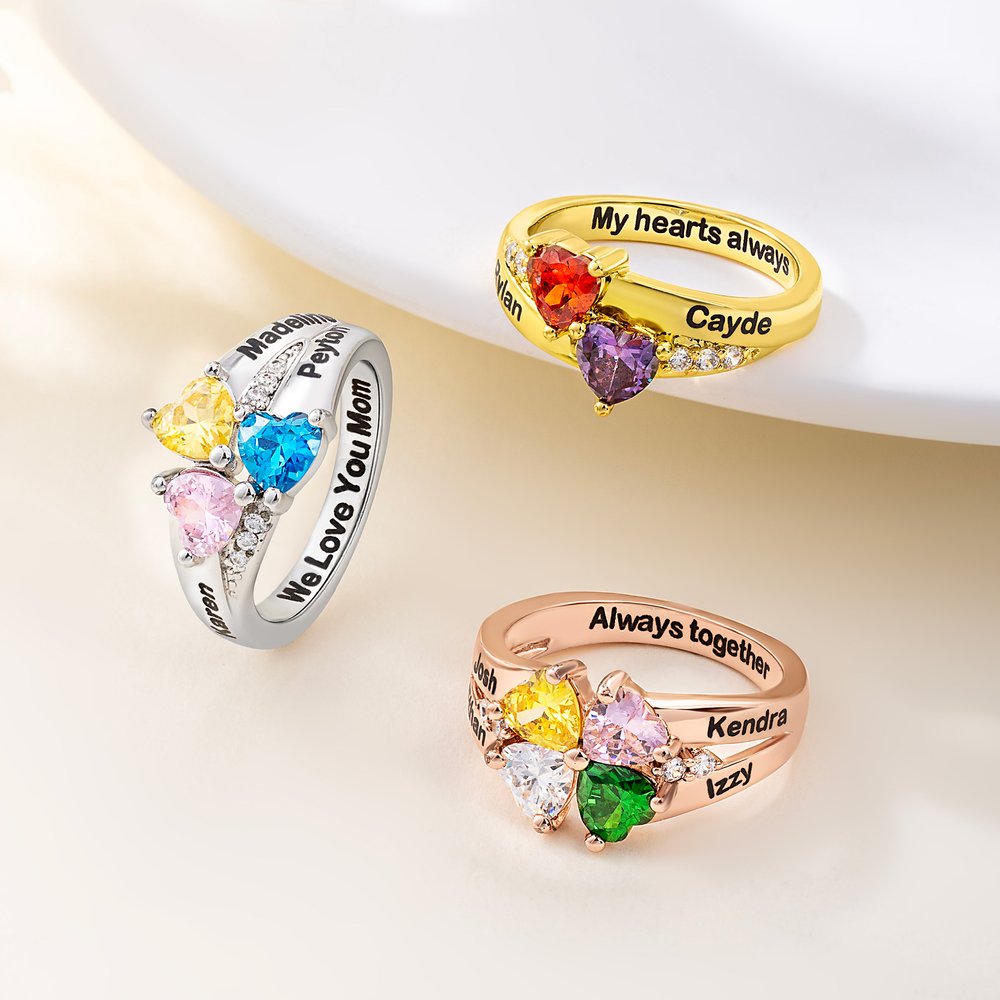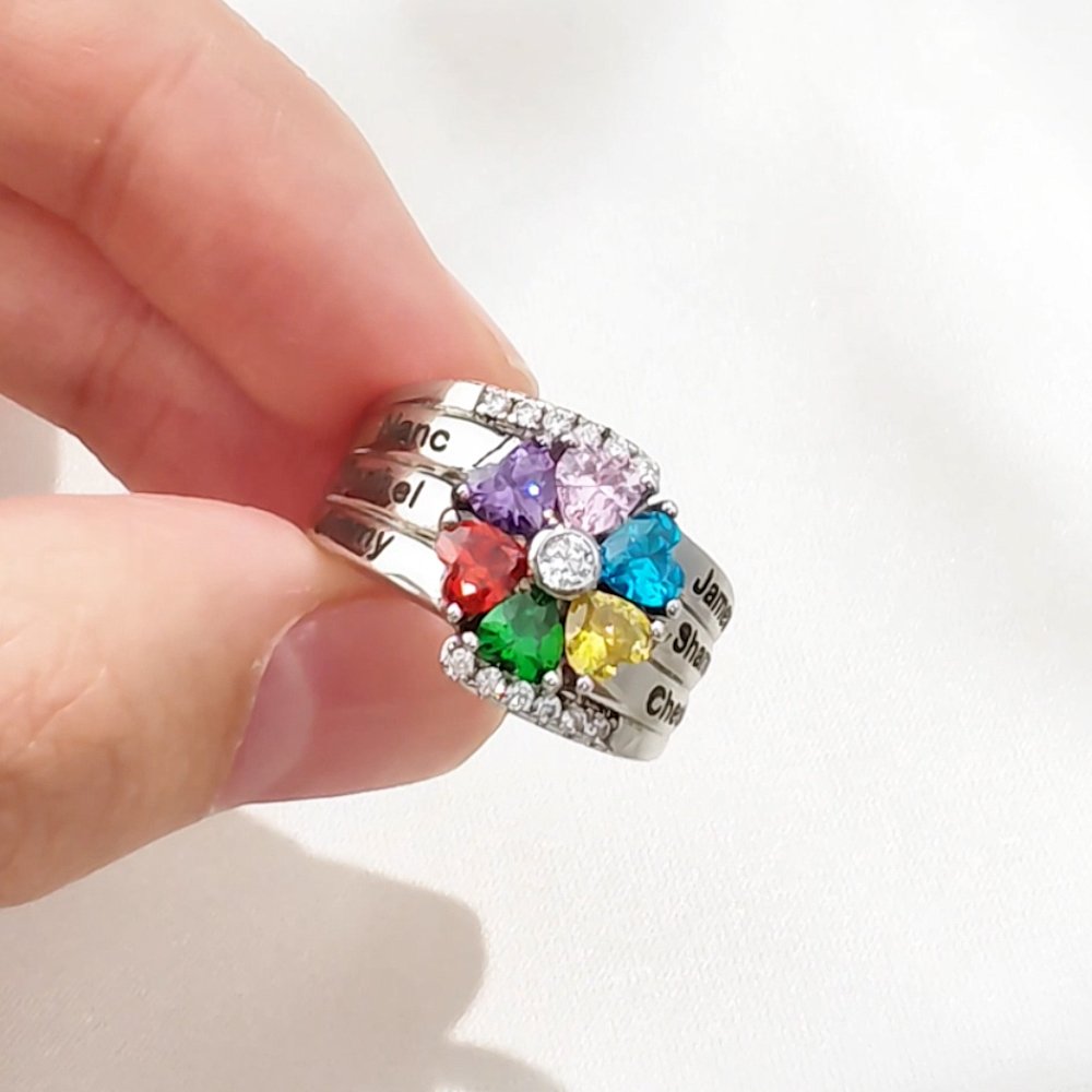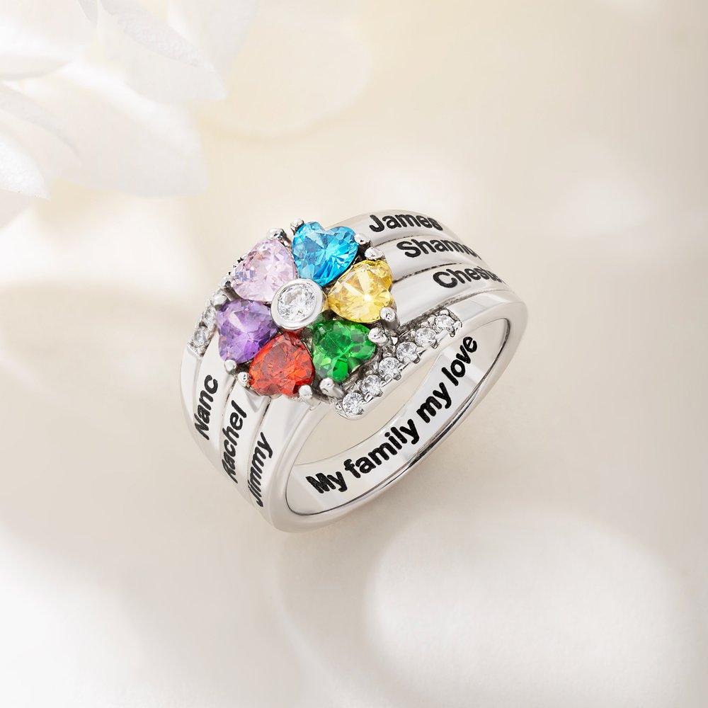 Cette magnifique bague de naissance peut être personnalisée avec 1-8 pierres de naissance en forme de cœur, des noms gravés et un texte à l'intérieur, représentant les liens que vous partagez avec les membres de votre famille bien-aimée. Chaque pierre en forme de cœur entoure la pierre centrale en zircon, formant un pétale qui symbolise le lien profond qui vous unit à vos proches.