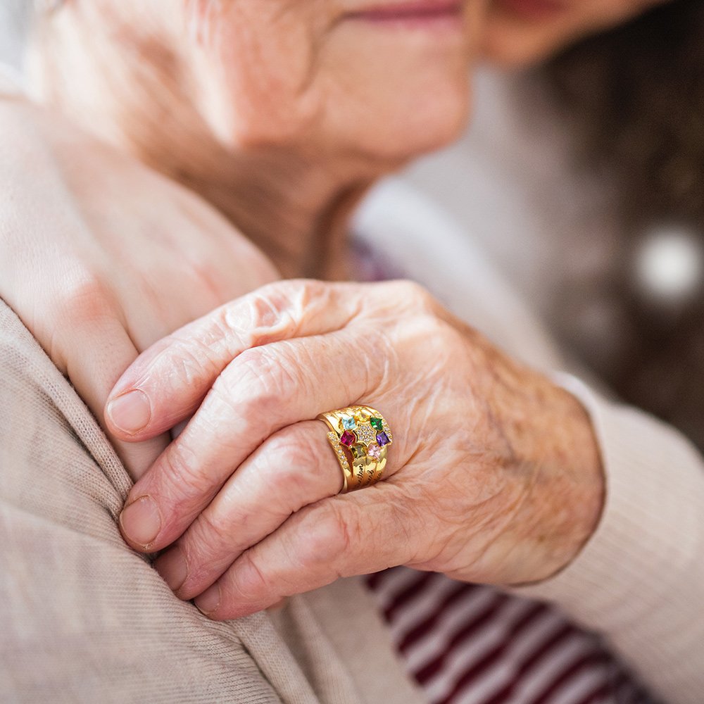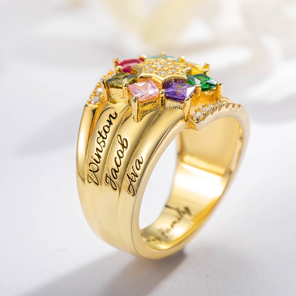 •Bague significative incrustée de pierres de naissance carrées assorties de 1 à 9 prénoms gravés. Meilleur témoin pour toute relation significative de 1 à 9 personnes.