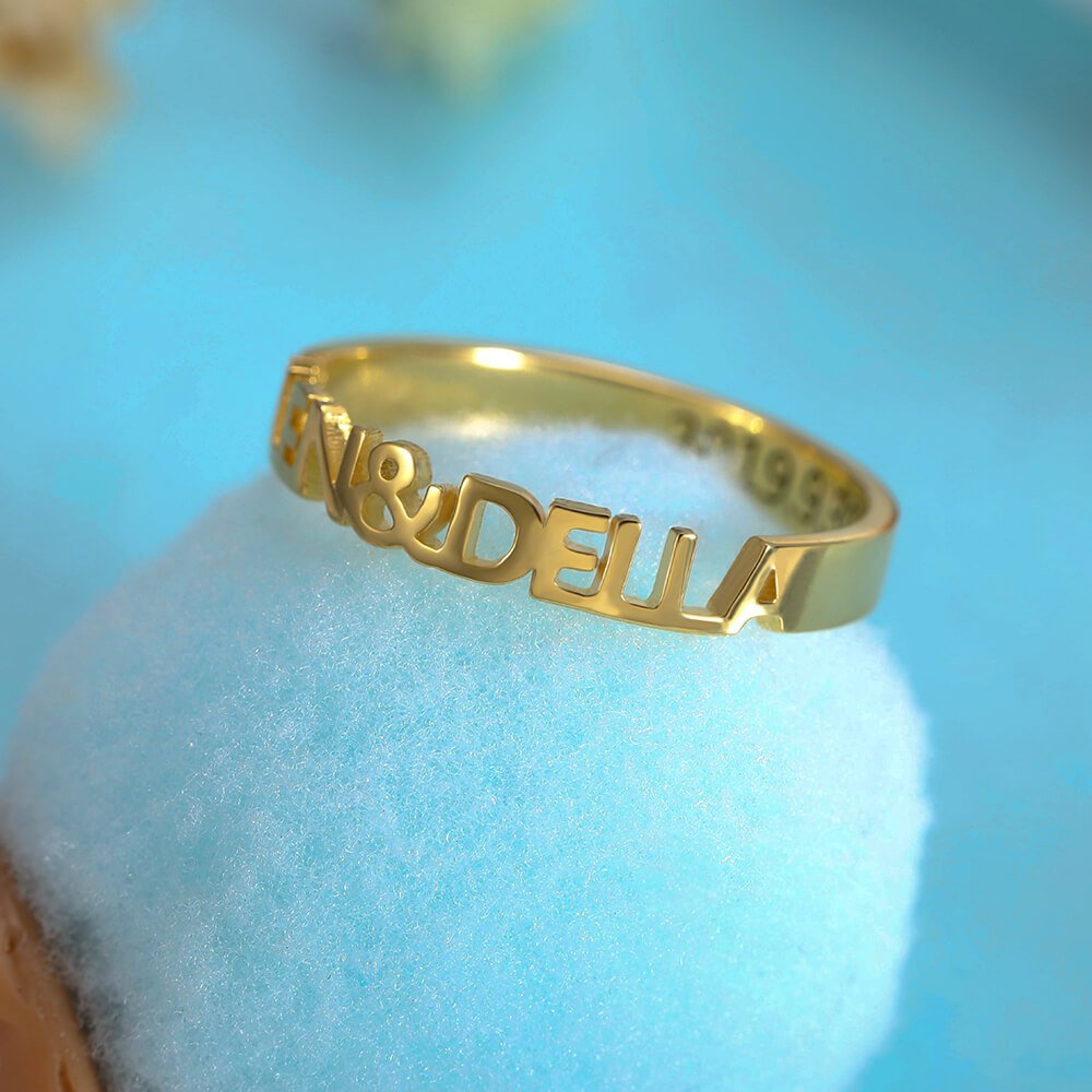 Vous pouvez ajouter votre nom à la bague et personnaliser la rédaction dans le cercle pour rendre la bague plus unique et créer un bijou exclusif.