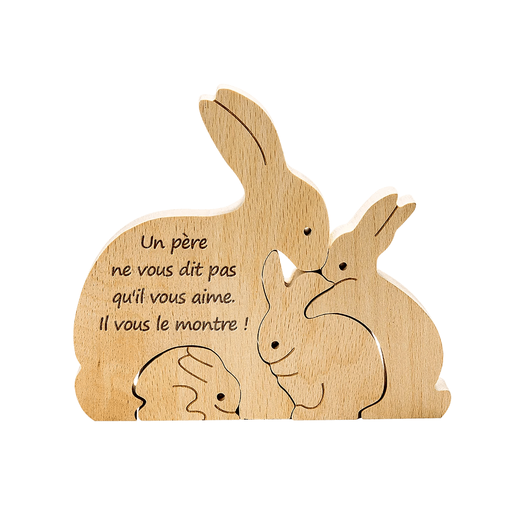 • Matière en bois, légère, solide et durable. Les deux grands lapins représentant la mère et le père, les petits lapins nichés dans leurs bras représentant les enfants. L'implication exprime l'harmonie et la chaleur de la famille mais montre aussi l'amour infini des parents pour leurs enfants et leur dépendance vis-à-vis de leurs parents. Décoration utilisée comme un jouet de puzzle pour que vos enfants jouent et développent leur intelligence dans le divertissement.