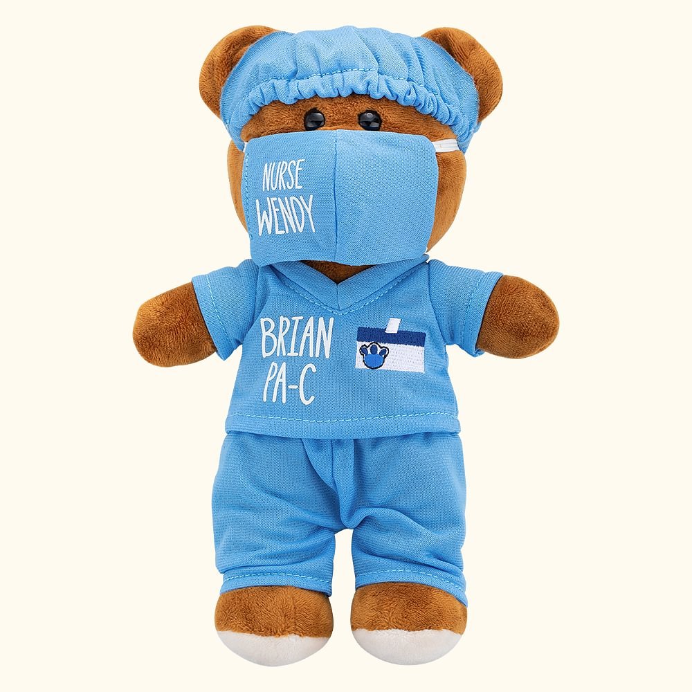 - Le nom et le titre peuvent être ajoutés au masque, à la chemise ou aux deux. Tous les ours sont vêtus de leur blouse, de leur bonnet et de leur masque. L'ours mesure 21 cm (environ 8 pouces).