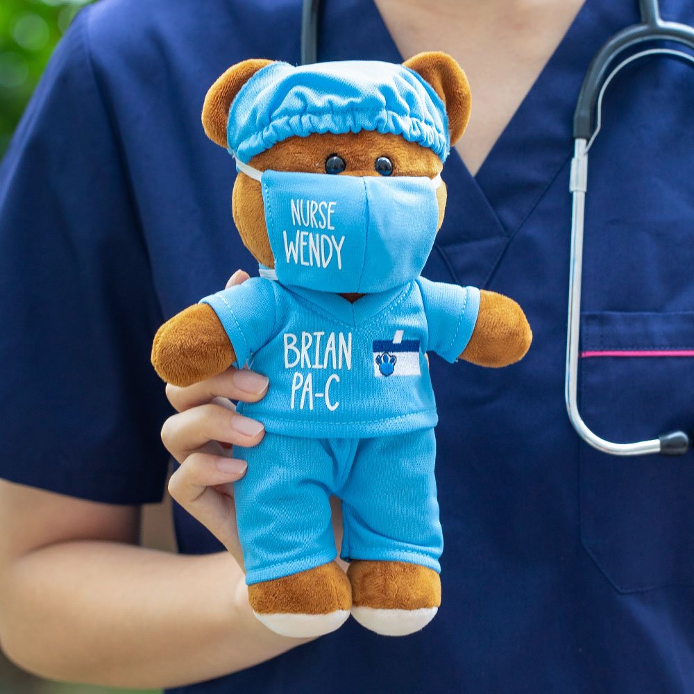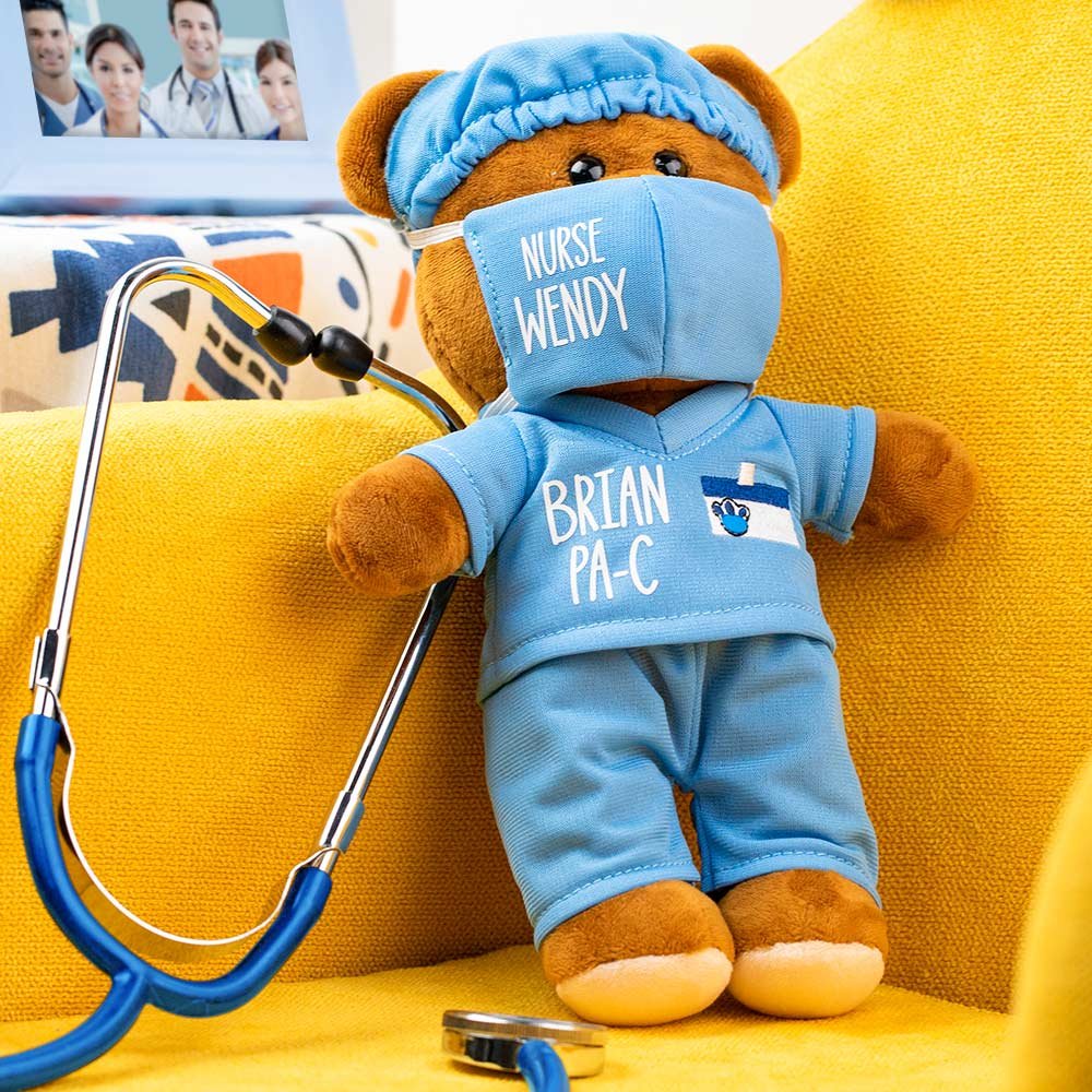 - Le nom et le titre peuvent être ajoutés au masque, à la chemise ou aux deux. Tous les ours sont vêtus de leur blouse, de leur bonnet et de leur masque. L'ours mesure 21 cm (environ 8 pouces).