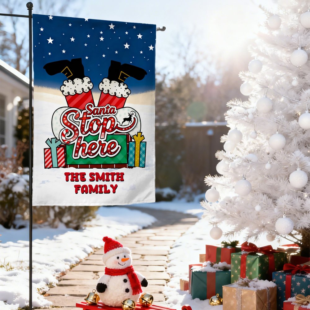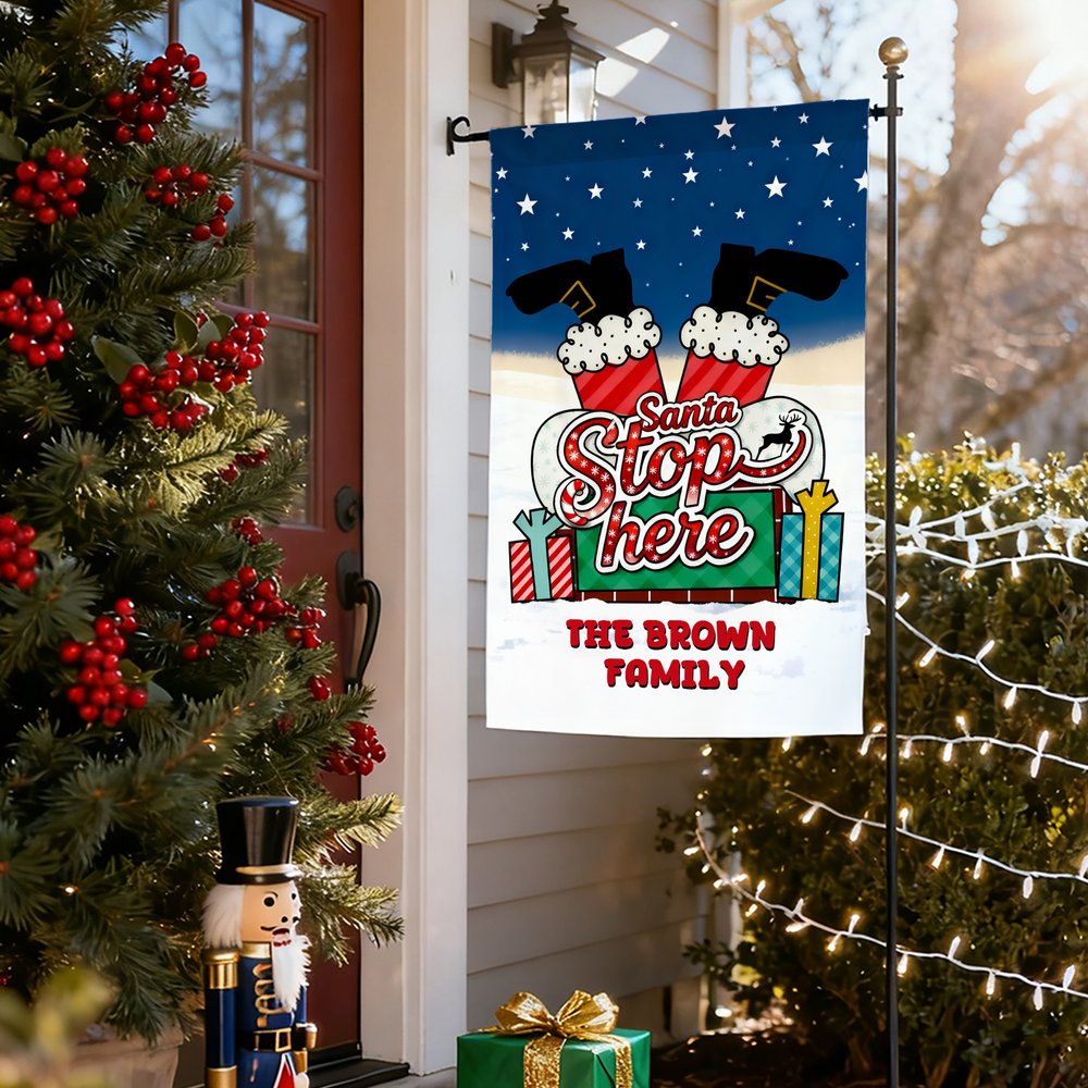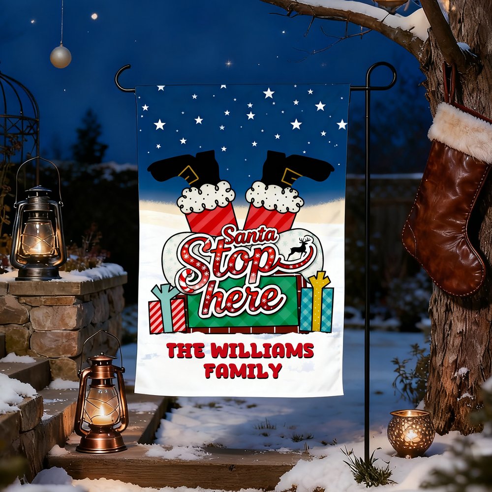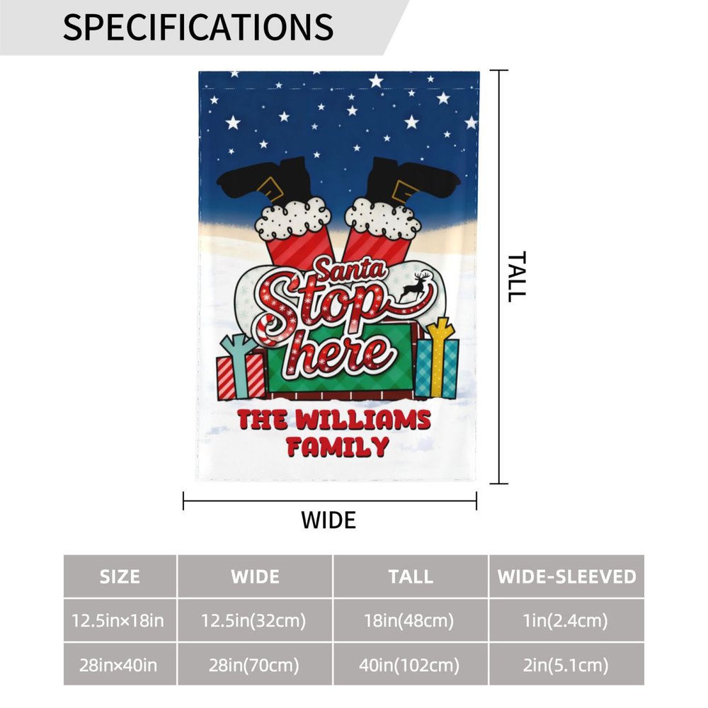 Répandez la chaleur et l'impatience des fêtes à votre fenêtre et dans votre cour avec ce drapeau de Noël personnalisé ! Le slogan "Santa Stop Here", associé à l'image du Père Noël sortant de la cheminée, évoque instantanément des vacances féeriques, injectant une atmosphère joyeuse et ludique à l'extérieur de votre maison.