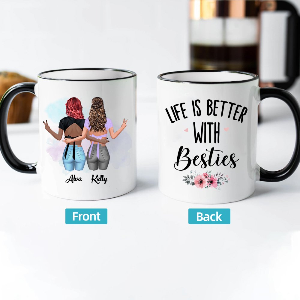 C'est un excellent cadeau pour vos meilleures amies, personnalisez ce mug délicat avec votre nom et celui de votre amie, il rendra votre cadeau magnifique avec le magnifique fond et le slogan "Life is better with Besties" !