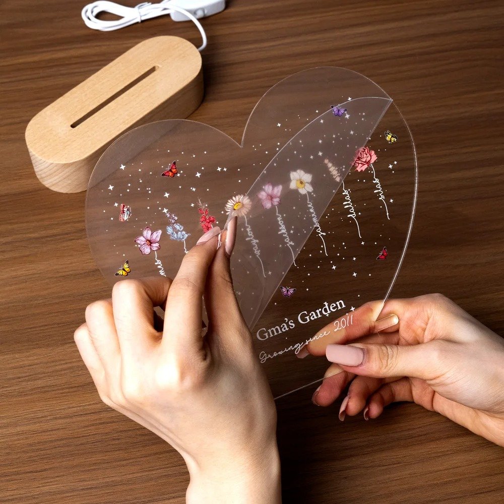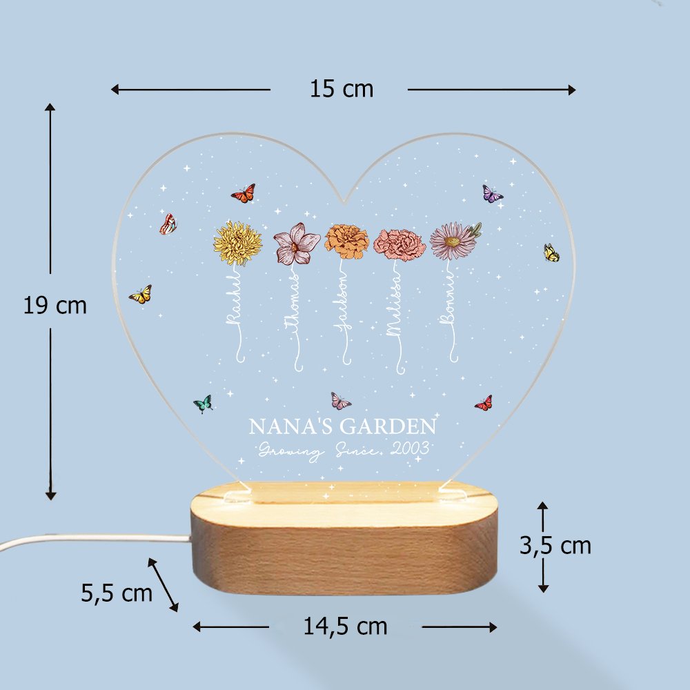 Veilleuse LED en Forme de Cœur Personnalisée avec 1 à 12 Fleurs de Naissance Noms Titre et Texte Cadeau Fête des Mères pour Maman Grand-Mère