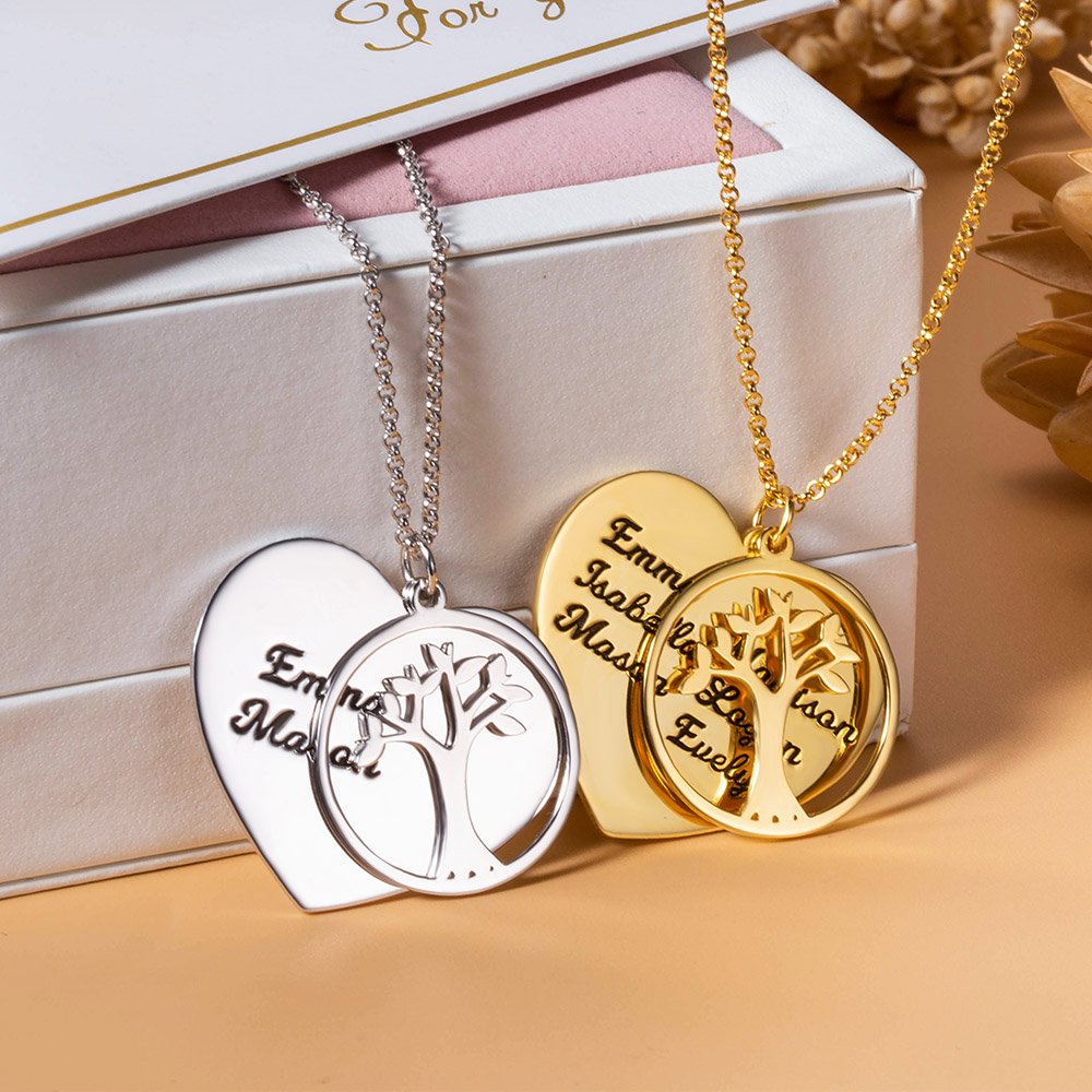 •Fabriqué finement à la main et plaqué en argent sterling scintillant, collier cœur unique et significatif. Sur le pendentif du collier cœur, prénoms des enfants personnalisés gravées signifiant que chaque enfant est profondément gravé dans le cœur de la mère. Arbre de vie représentant la croissance unie d'une famille, le bonheur et le contentement.