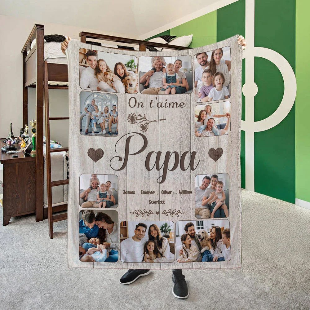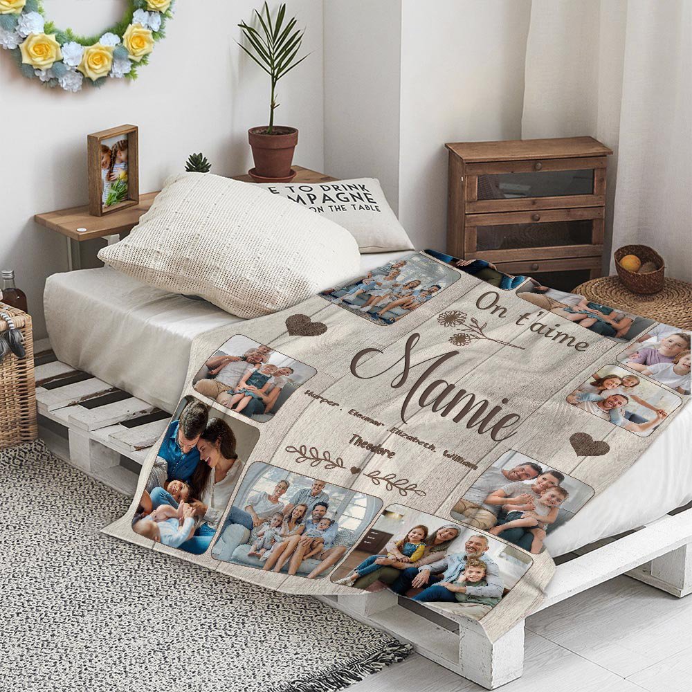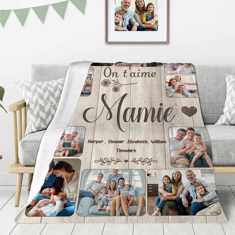 Célébrez les liens profonds et affectueux qui unissent les générations grâce à cette couverture. Téléchargez jusqu'à 10 photos de famille et 1 à 8 noms pour créer un collage émouvant. Chaque image cousue sur cette couverture rappelle des souvenirs inoubliables et la chaleur de la famille.