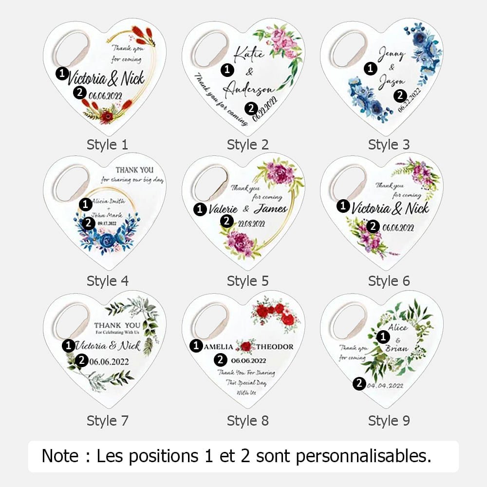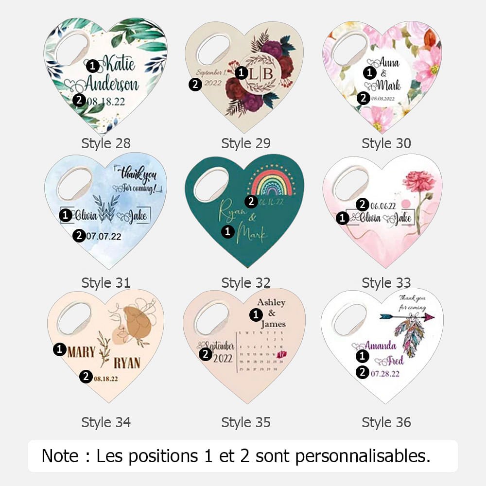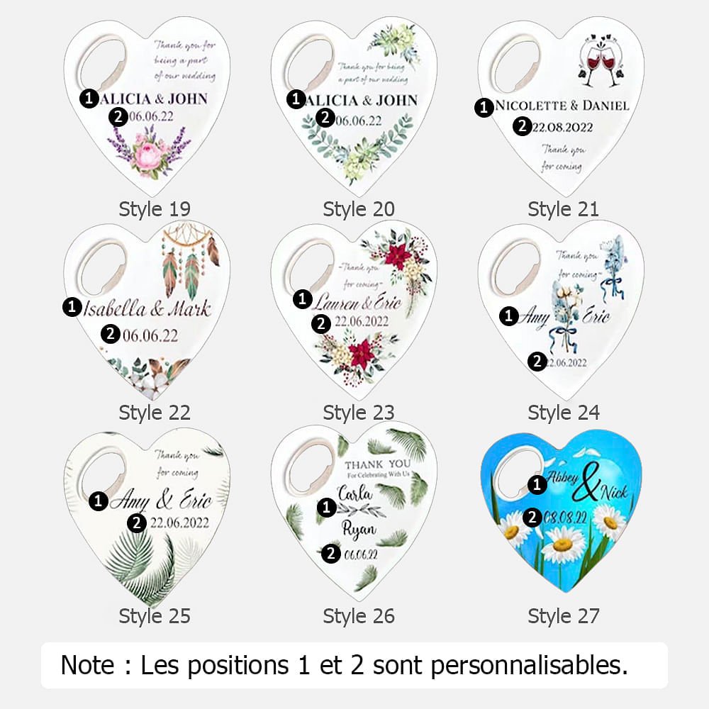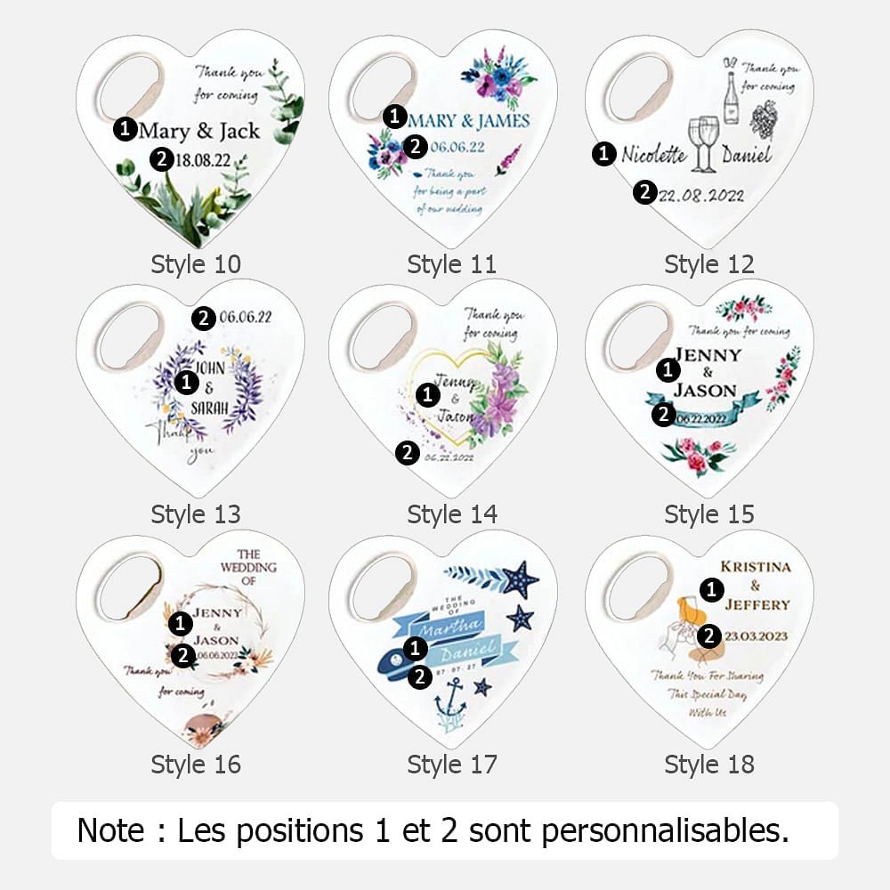 Quelle meilleure façon de célébrer un anniversaire de mariage que de créer un souvenir durable ? Notre décapsuleur en forme de cœur offre des options de personnalisation qui vous permettent de marquer cette occasion spéciale de manière unique. Gravez le nom du couple et la date du mariage sur la surface du décapsuleur, pour en faire un souvenir précieux qu'ils chériront à jamais.