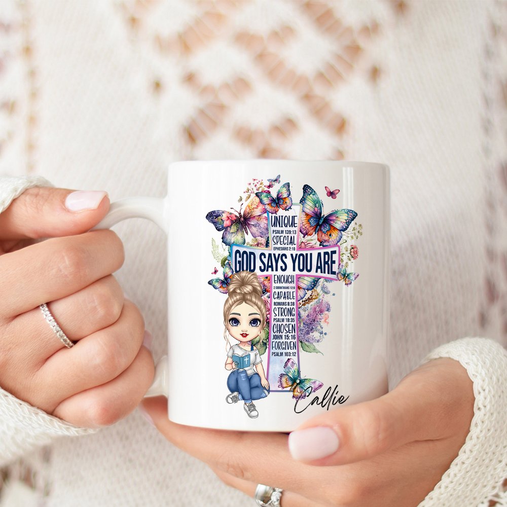 Ce mug avec une croix et un motif floral en forme de papillon est le cadeau idéal pour les femmes chrétiennes. La personnalisation de son nom avec un personnage de dessin animé personnalisé ajoute à son caractère unique, et vous pouvez le personnaliser avec des options allant des cheveux aux vêtements.