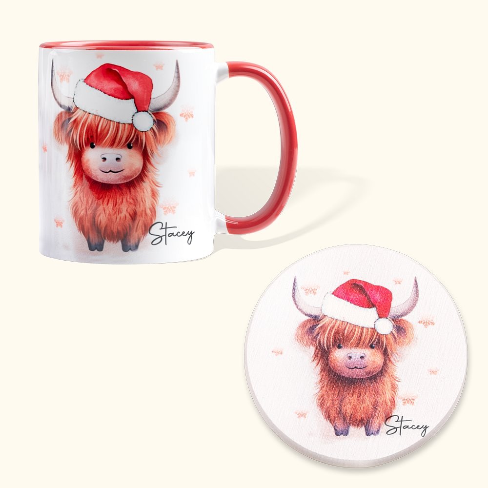 Ce mug magnifiquement conçu représente une adorable vache des Highlands, connue pour ses longs poils hirsutes et ses cornes distinctives. Il s'agit non seulement d'un choix pratique, mais aussi d'une pièce décorative qui ajoute du charme à toute cuisine ou à tout espace de travail. Le sous-verre optionnel protège non seulement les surfaces mais complète également le design du mug, créant ainsi un ensemble complet plein de style de Noël.