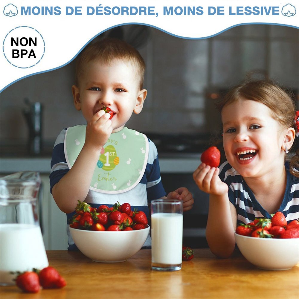 Ce bavoir est orné de la citation "1ère Pâques" et de charmants œufs de Pâques en forme de lapin, reflétant parfaitement l'esprit de Pâques. Les motifs mignons et éclatants ne manqueront pas de faire sourire votre bébé et de créer une atmosphère de fête pendant les repas.