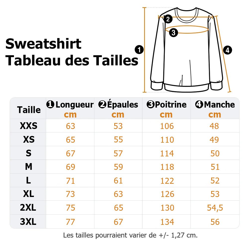 | Mesure: | Sweat-shirt - XXS, XS, S, M, L, XL, 2XL, 3XL Sweat à capuche - XXS, XS, S, M, L, XL, 2XL, 3XL |