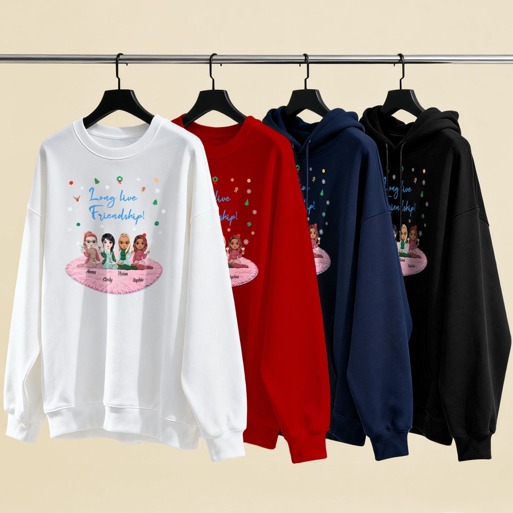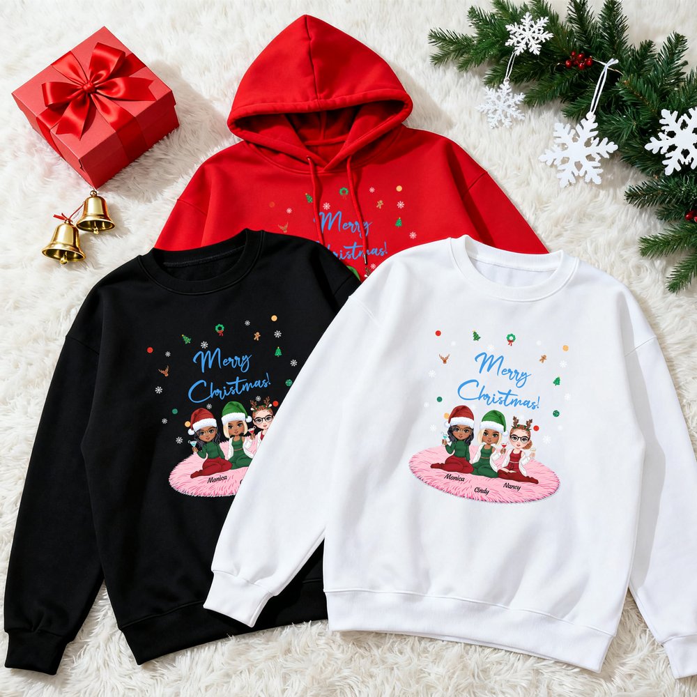 Ce vêtement combine astucieusement 2 à 6 personnages de dessins animés avec leurs noms, en incorporant des éléments festifs tels que des chapeaux de Noël et des flocons de neige pour créer un souvenir d'amitié unique. La coiffure et la tenue de chaque personnage peuvent être personnalisées pour refléter la personnalité unique de votre ami(e), créant ainsi un design vivant et exclusif.