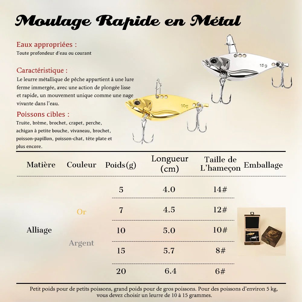 L'ensemble est fabriqué en alliage de zinc de haute qualité qui résiste à la rouille. L'hameçon est très pointu et peut résister à une pêche rigoureuse. La boîte en bois assortie offre un rangement élégant et protège les leurres, garantissant qu'ils resteront intacts lors de votre prochaine aventure de pêche.