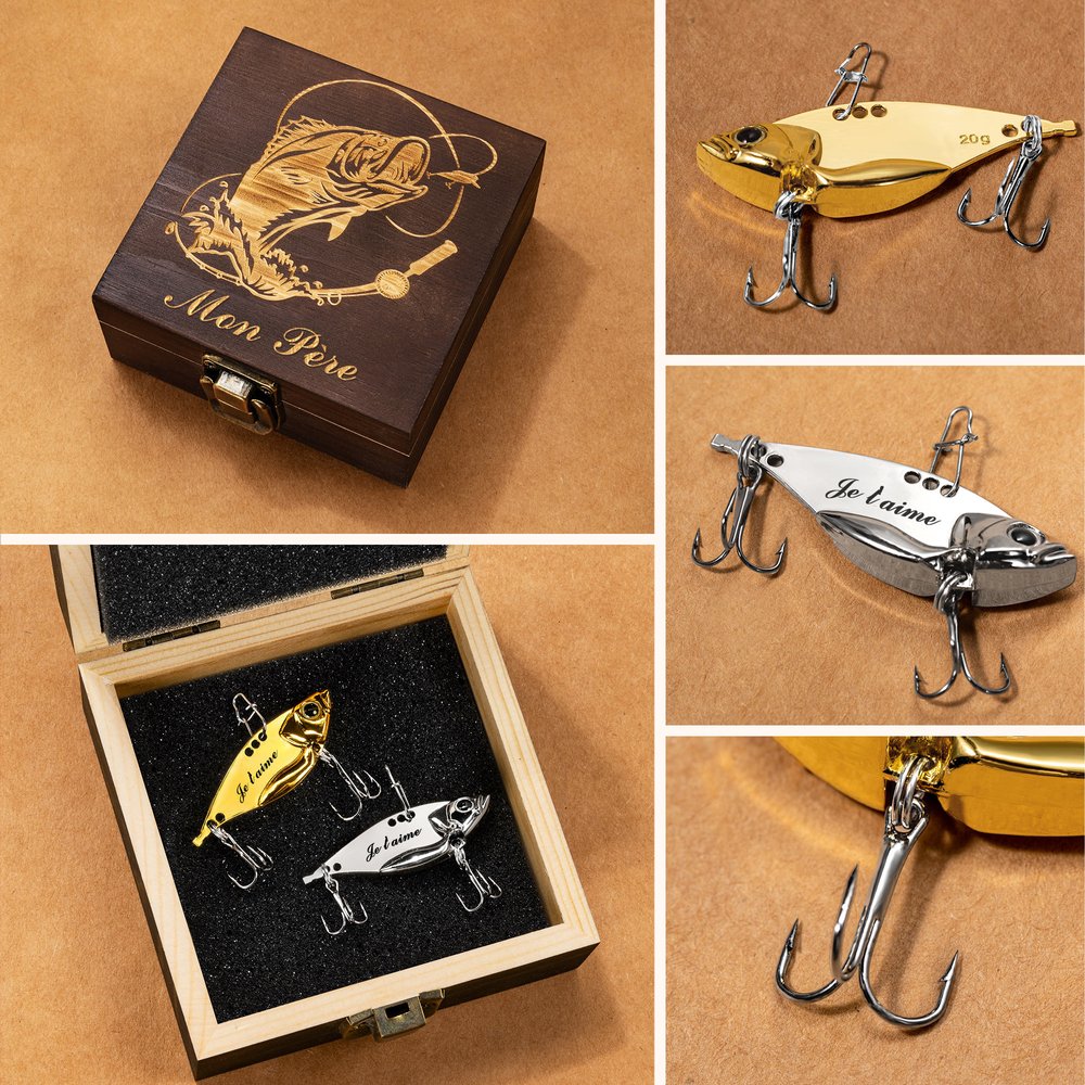 Ce leurre bionique est très réaliste, comme un vrai leurre de poisson. Cet ensemble comprend une boîte en bois texturée vintage avec un motif de pêche fixe et des mots personnalisables gravés sur le devant, et deux leurres à l'intérieur, l'un des leurres en or et l'autre en argent, avec 5 types de poids au choix, adaptés à la pêche dans différentes situations. La finition métallique et le design réaliste font ressortir ces leurres et offrent aux pêcheurs une expérience de pêche passionnante