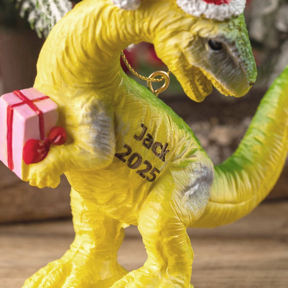 Apportez un charme préhistorique à votre arbre de Noël ou à vos cadeaux grâce à cet ornement dinosaure. Avec son bonnet de Père Noël et son design qui serre le cadeau, cet ornement ne manquera pas de capter l'attention des enfants et des adultes.
