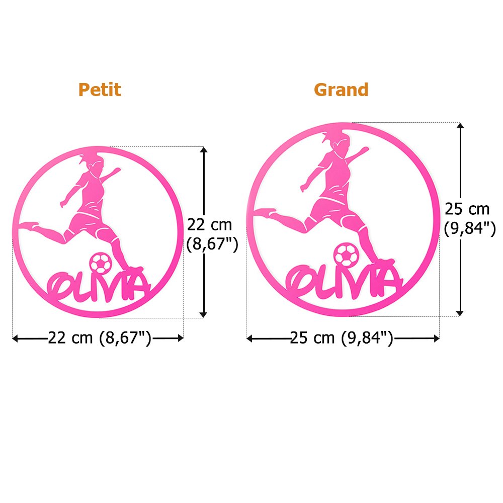 Célébrez la passion de votre enfant pour le football ! Cette décoration murale circulaire vibrante présente une découpe d'un garçon ou d'une fille au milieu d'un coup de pied (11 couleurs pour les garçons, 10 pour les filles). Ajoutez un nom personnalisé pour une touche unique. Parfait pour les chambres à coucher, les salles de jeux ou les crèches.