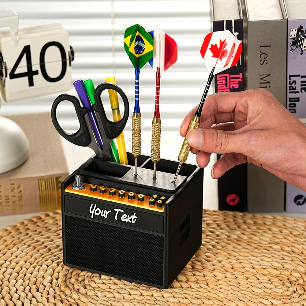 Notre porte-pics de guitare ou porte-fléchettes reproduit l'ambiance classique d'un amplificateur de guitare vintage, alliant les styles rétro et moderne. Il est parfait pour les amateurs de musique et de fléchettes, car il met en valeur l'aspect et les détails emblématiques des amplis classiques. Vous pouvez facilement le personnaliser en y ajoutant un nom, ce qui rend chaque pièce unique.