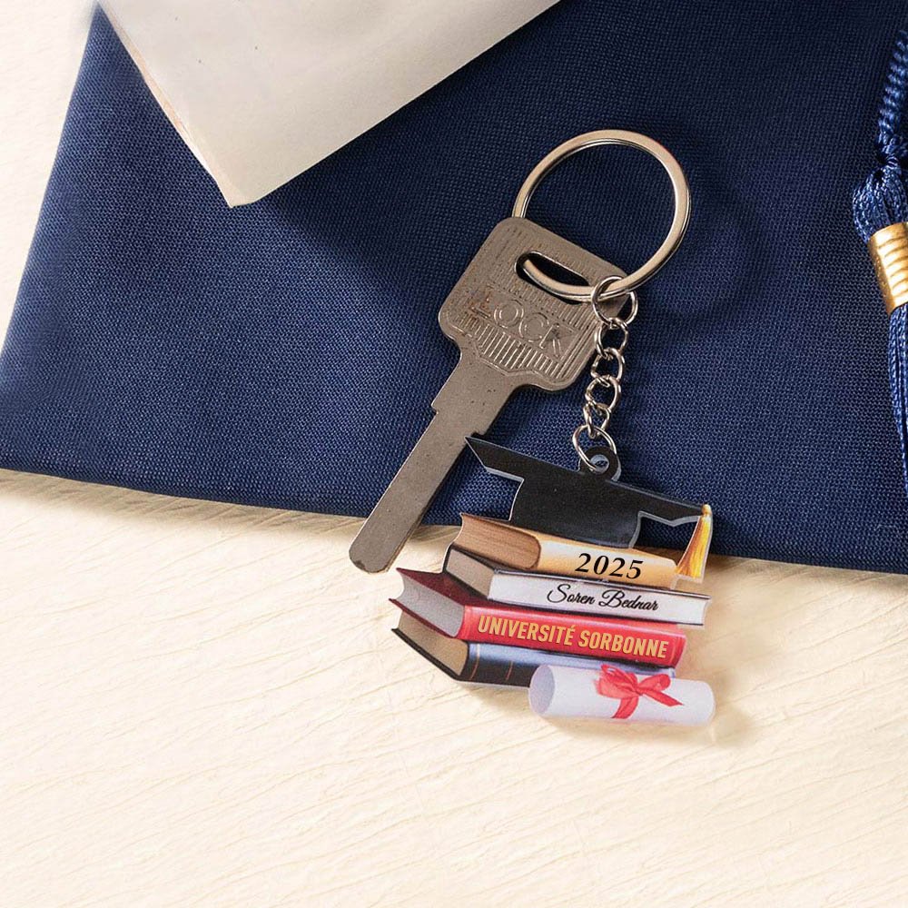 Le design de nos porte-clés s'inspire de la période annuelle de remise des diplômes, qui est un moment important dans nos vies et un beau moment qui mérite d'être vu et préservé. Nous dissimulons tous les vœux des diplômés dans ce porte-clés à effet 3D composé d'un chapeau de fin d'études, d'un diplôme et de plusieurs livres empilés les uns sur les autres.