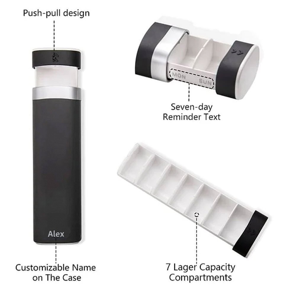 L'étui du pilulier peut être personnalisé avec un nom ou un texte de votre choix, ce qui permet d'identifier facilement vos médicaments ou vos compléments. Fini les confusions et les mélanges ! Que vous soyez un professionnel occupé, un grand voyageur ou une personne souffrant d'une maladie chronique, notre pilulier hebdomadaire de 7 jours est un outil essentiel.