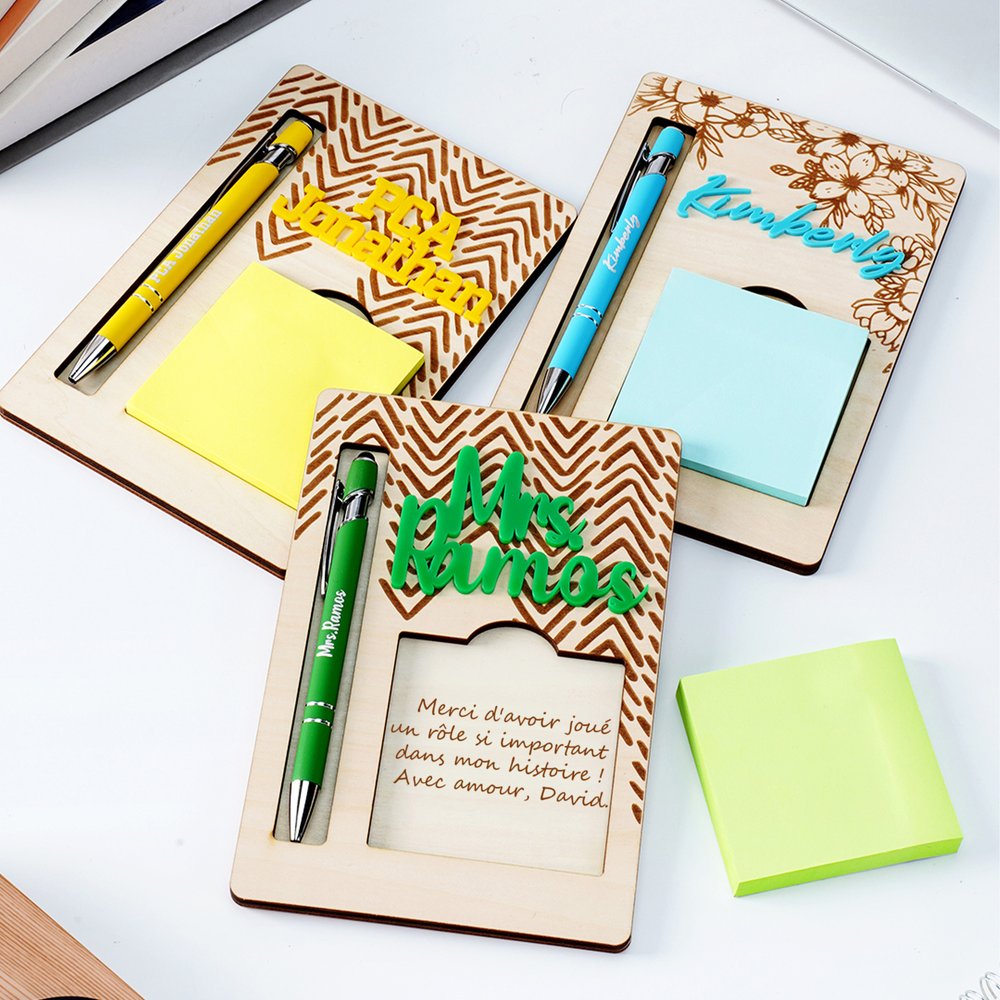 Un stylo, une note autocollante et un stylo à bille avec un nom gravé sont inclus, permettant aux utilisateurs de créer ou de marquer librement. Le porte-notes est doté d'une fente spéciale pour le stylo, ce qui permet de ranger les outils d'écriture de manière ordonnée.