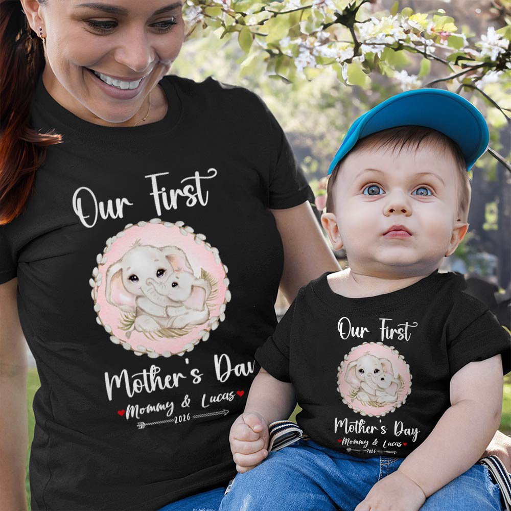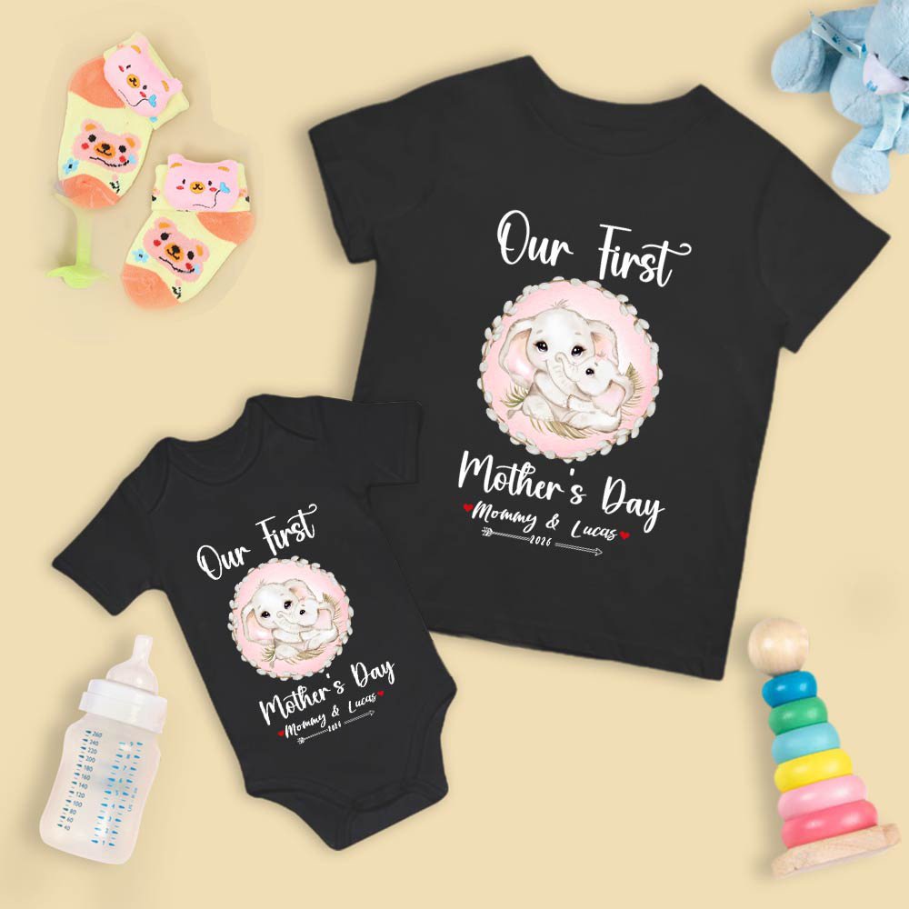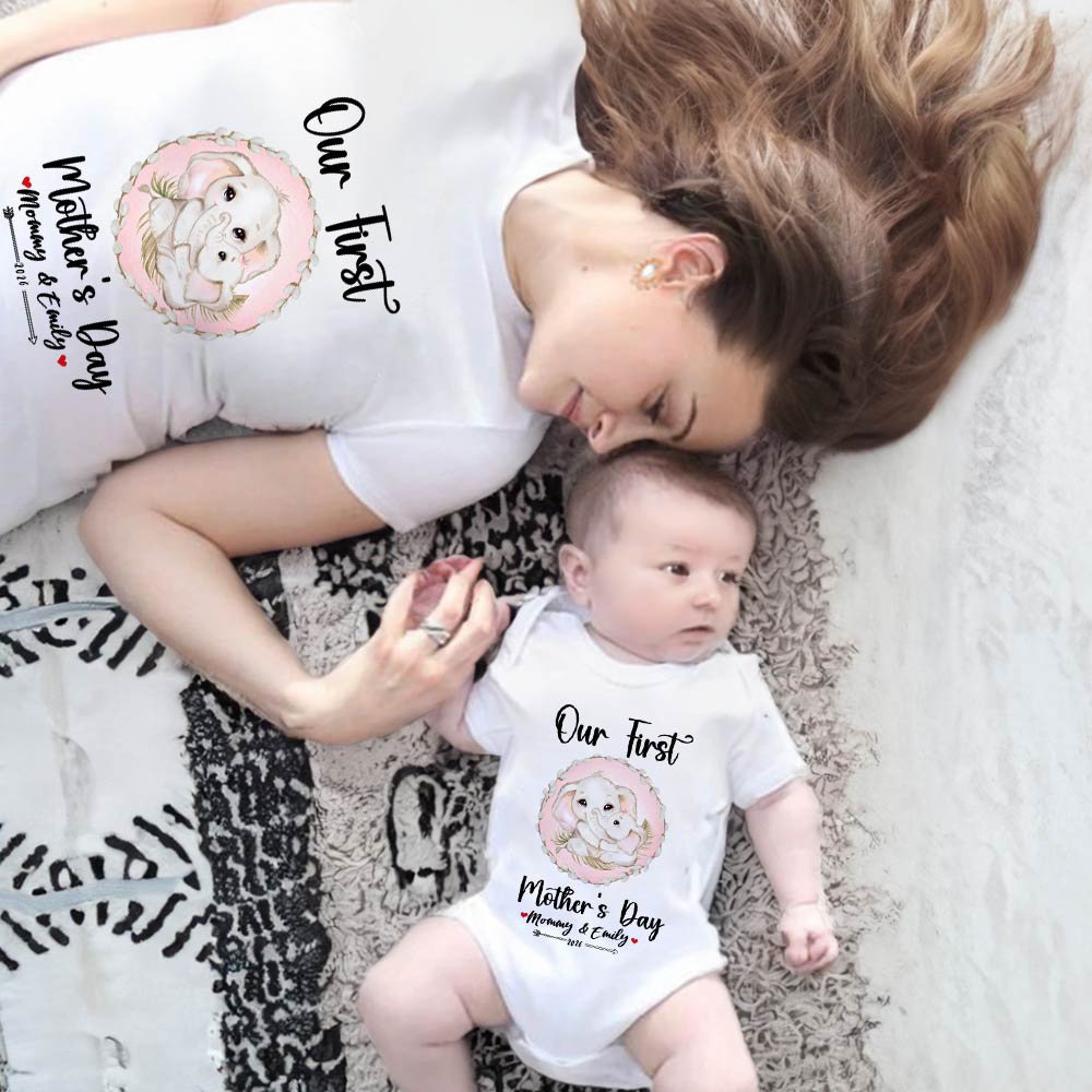 Conçu avec un adorable motif d'éléphant parent-enfant, ce vêtement capture l'essence de l'amour et de la tendresse entre une mère et son enfant. L'éléphanteau niché dans les bras de sa mère symbolise le lien indéfectible et l'affection qu'ils partagent. Le texte de célébration "Notre première fête des mères" renforce encore l'atmosphère de fête et rayonne de chaleur et de joie.