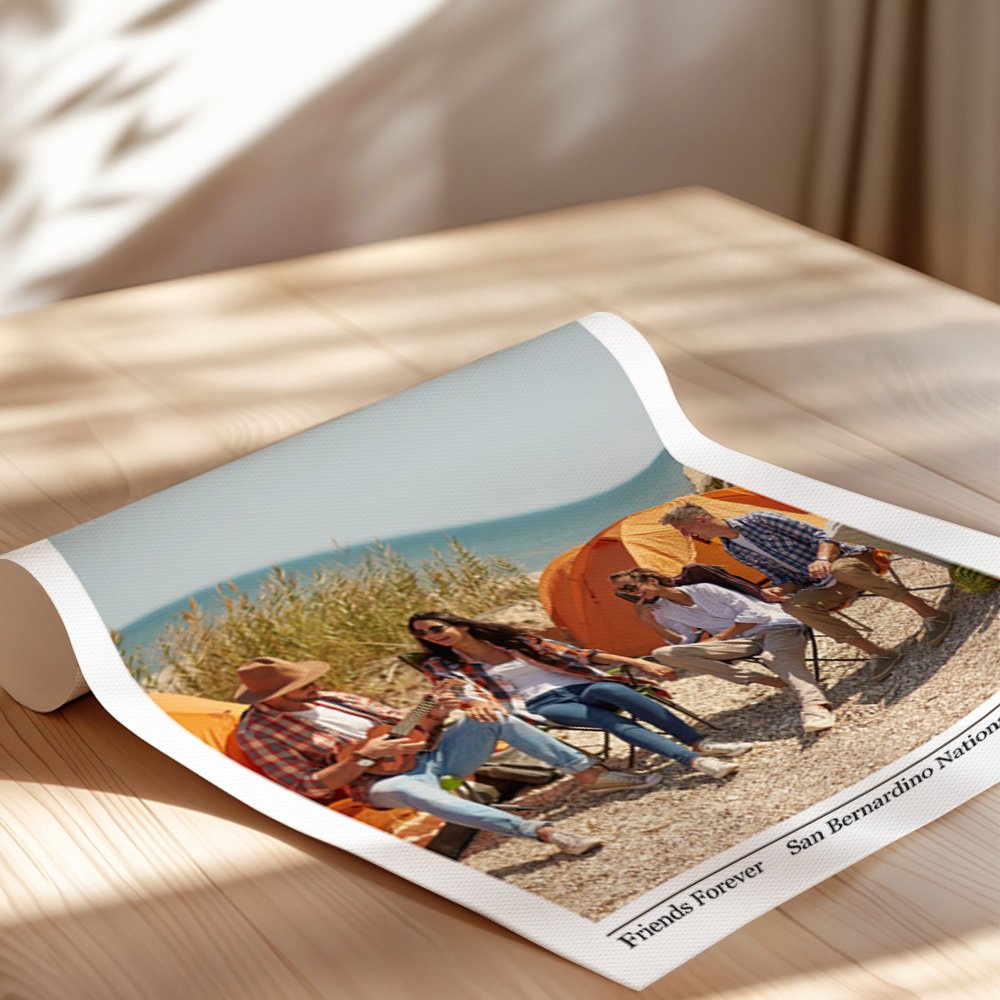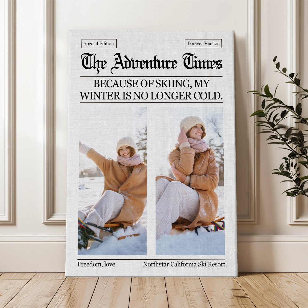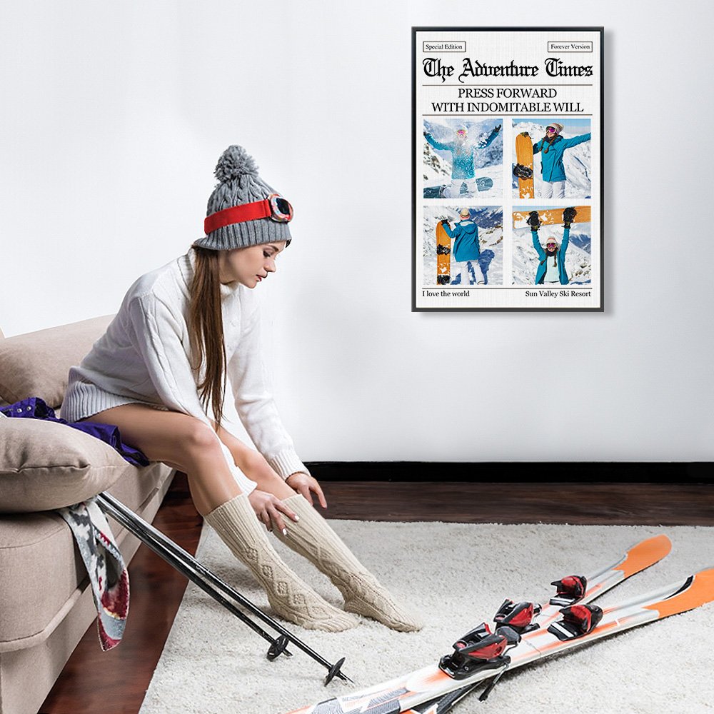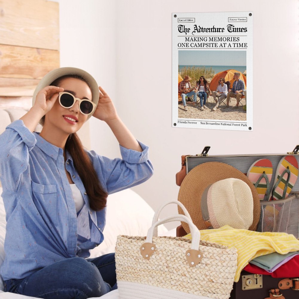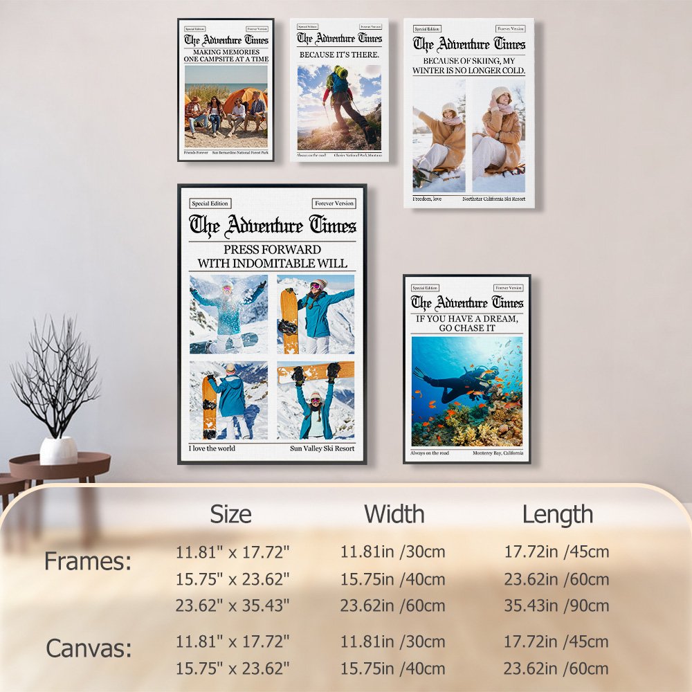 Cette peinture sur toile personnalisable présente un design de journal, vous permettant de présenter jusqu'à quatre de vos photos d'aventure préférées. Personnalisez-le avec du texte pour en faire une pièce unique qui reflète vos souvenirs inoubliables.