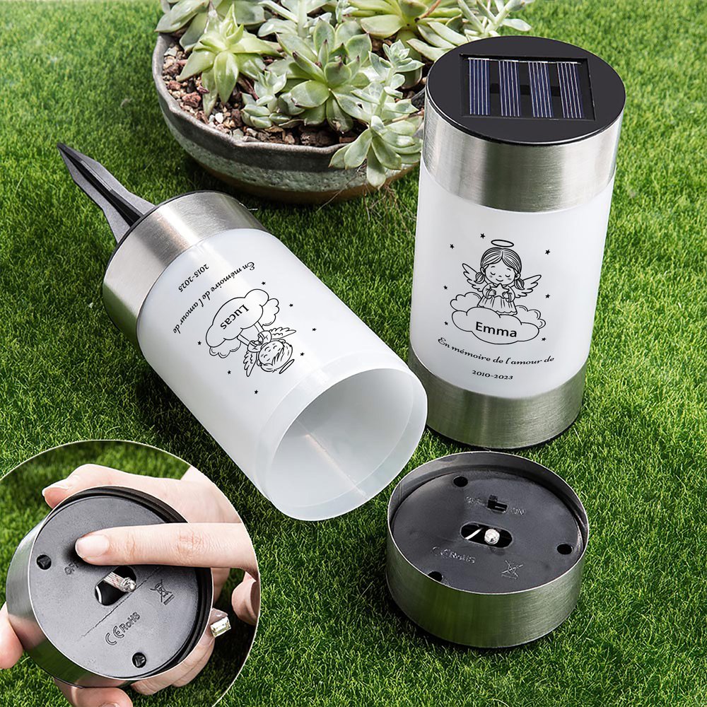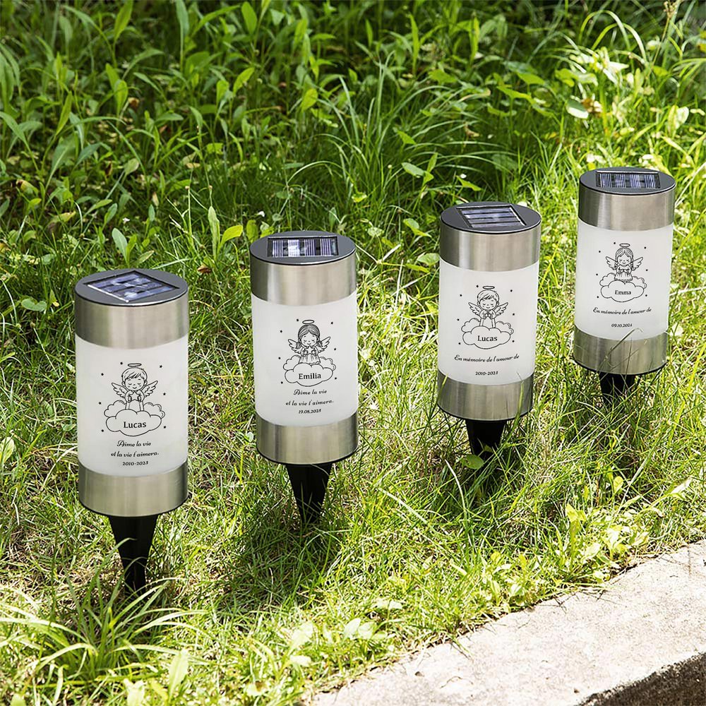 Cette lampe solaire de jardin est conçue sur le thème de la "commémoration des bébés anges". Il existe 4 types de formes de bébés anges avec des ailes, entourés de nuages et d'étoiles, accompagnés du nom du bébé, de la date commémorative et d'un texte réconfortant, faisant naturellement écho aux motifs de l'ange et de la nébuleuse, rendant la commémoration plus que statique, se transformant en un doux compagnonnage.