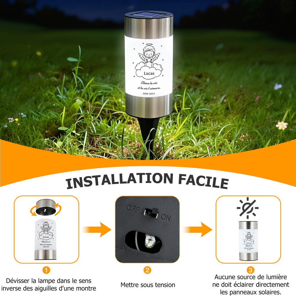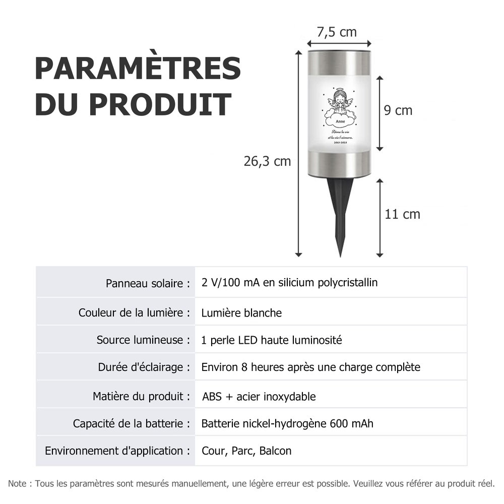 Fabriqué à partir des matières durables, il résiste aux conditions climatiques extérieures difficiles. La technologie d'impression avancée permet d'obtenir des images et des textes clairs et durables, ce qui facilite leur intégration dans les éléments. La lampe solaire est équipée d'un capteur optique qui peut s'allumer automatiquement la nuit et s'éteindre pendant la journée, offrant ainsi un éclairage fiable pour chaque nuit de commémoration des êtres chers.