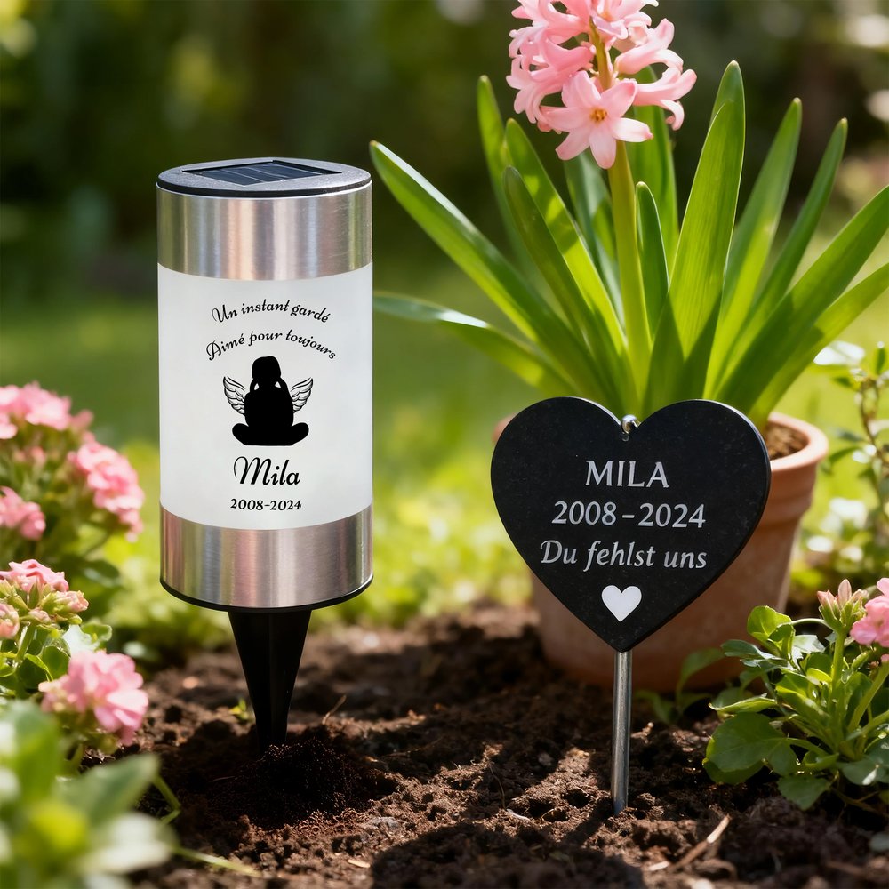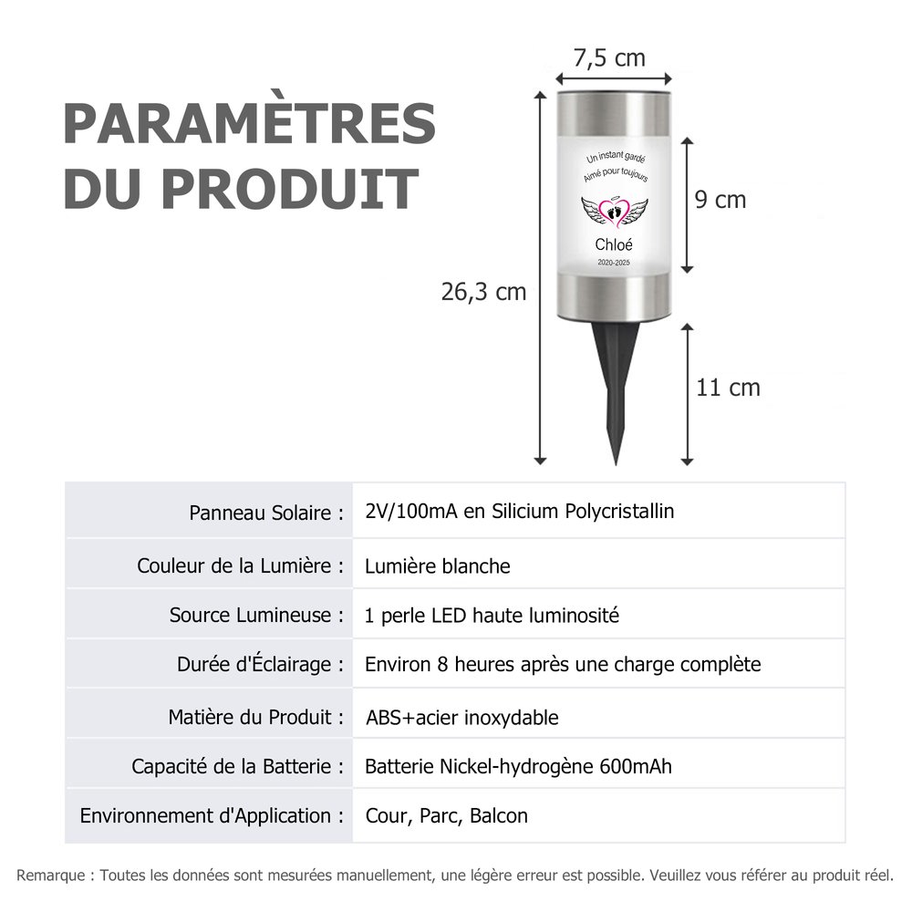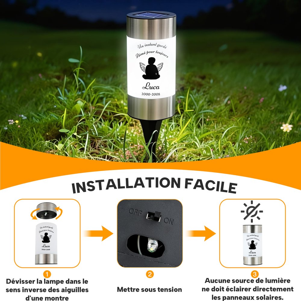 Cette lampe solaire de jardin est conçue avec chaleur et une signification profonde. Disponible dans une variété de silhouettes, y compris les bébés anges, les garçons et les filles, et les hommes et les femmes, elle répond à divers besoins commémoratifs. Vous pouvez personnaliser le nom et la date du décès pour rendre ce mémorial vraiment unique. Chaque élément du dessin incarne l'affection profonde et le souvenir de la personne décédée, en présentant les pensées visuellement et magnifiquement, offrant un réconfort spirituel lors de la commémoration d'un être cher.