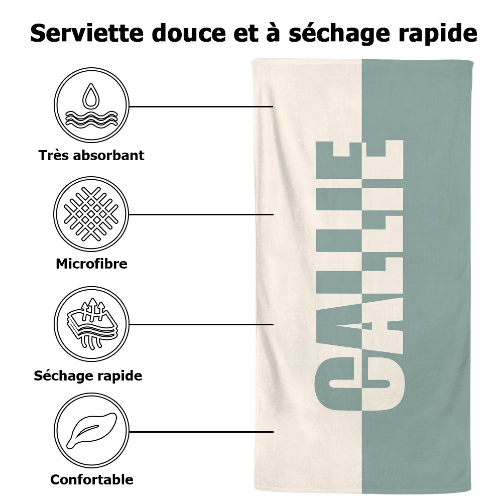 Le design de cette serviette de plage est mis en valeur par un collage bicolore, avec un grand nom au milieu. Il est simple et polyvalent, unique et individuel, plein de couches et d'amusement.