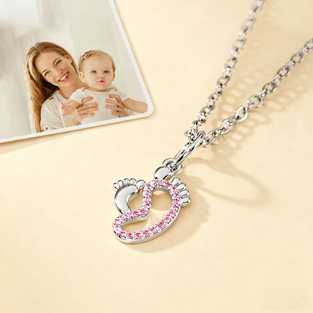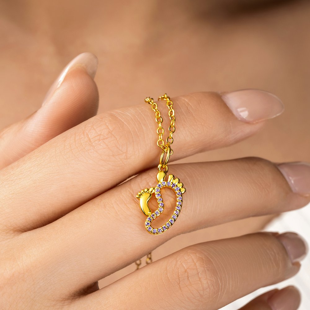 Ce collier comporte un charmant pendentif avec une grande et une petite empreinte de bébé, symbolisant le lien spécial entre la mère et l'enfant. La plus grande empreinte peut être ornée d'un cercle de pierres de naissance, ajoutant une touche personnelle qui représente le mois de naissance unique de votre enfant. Les détails complexes du pendentif capturent magnifiquement l'essence de ces moments précieux et en font un souvenir intemporel.