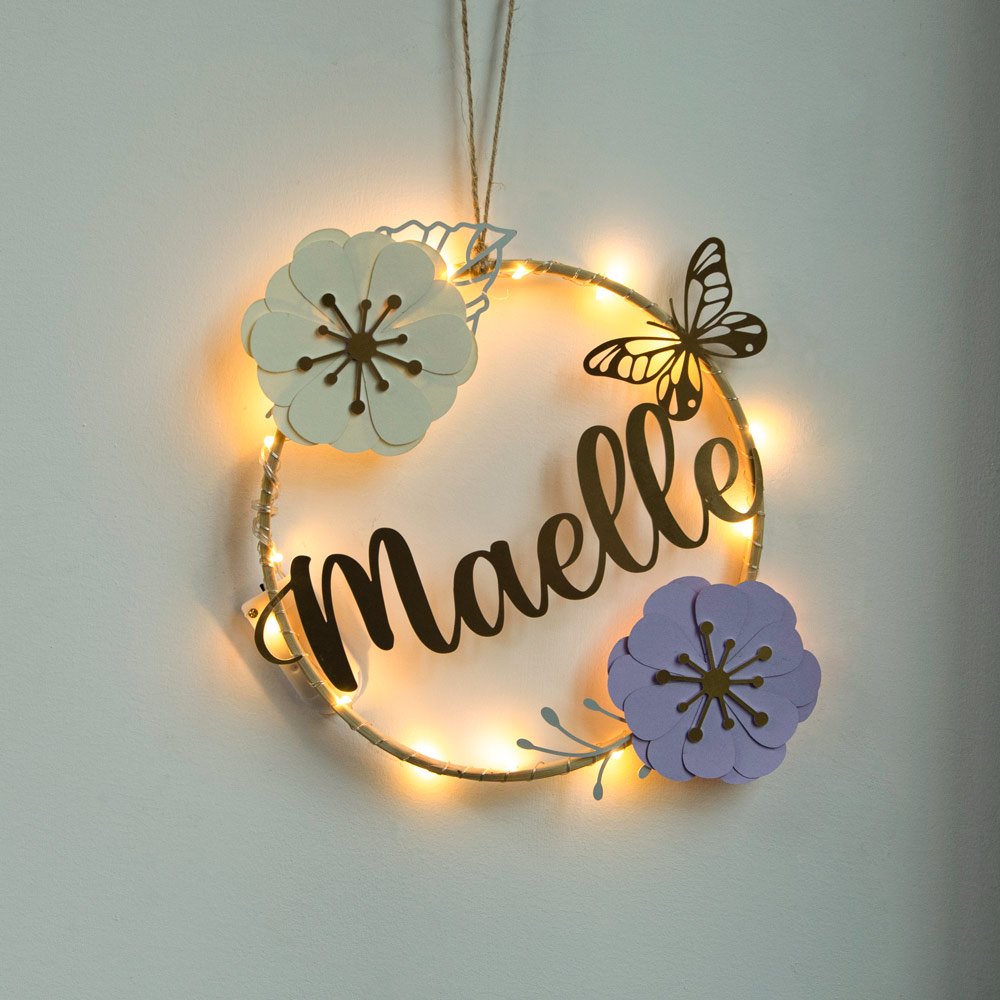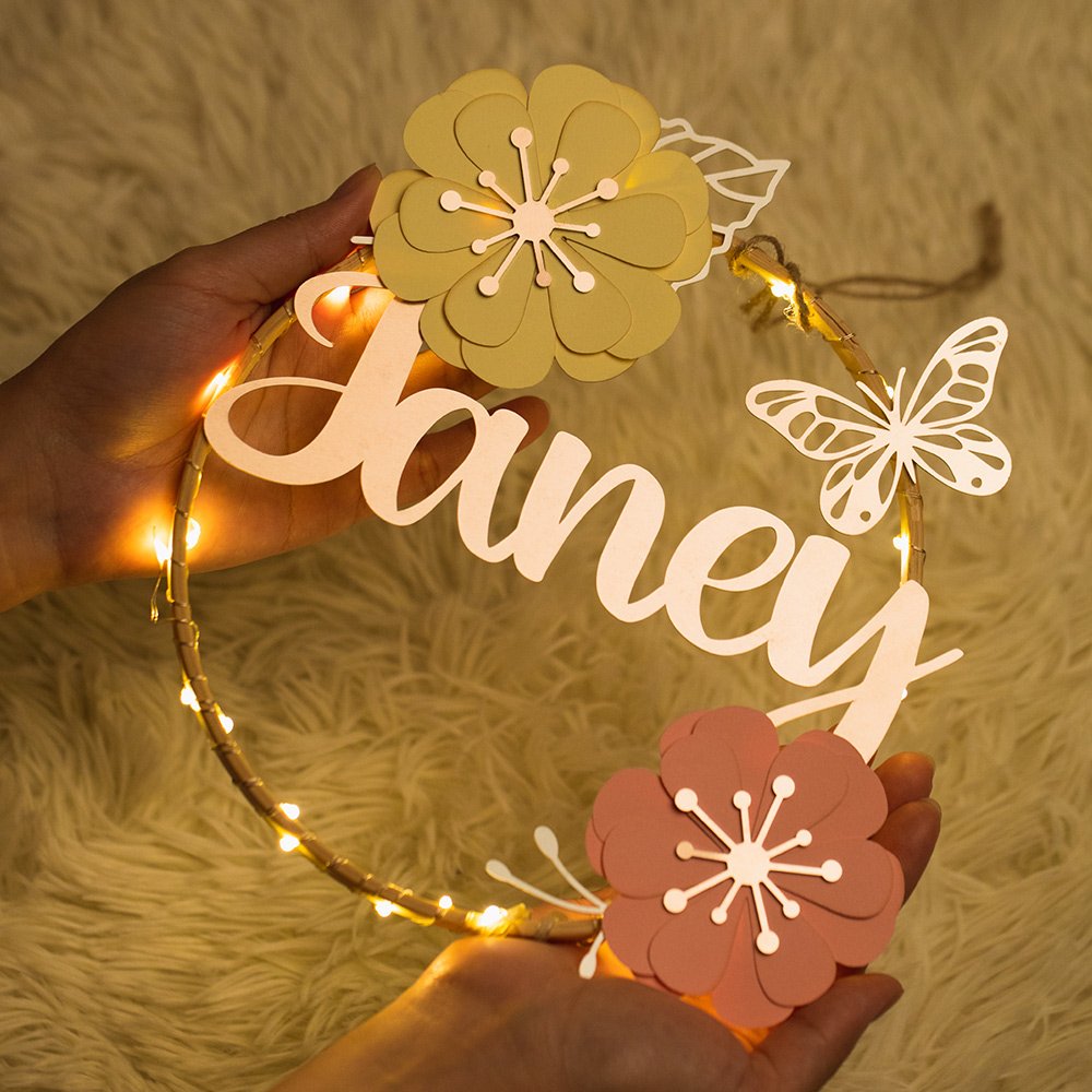 Dans la conception, nous avons combiné des fleurs en papier et des noms personnalisés pour les rendre non seulement beaux mais aussi très uniques et significatifs. Les bandes de bambou sont enroulées en cercle, et les petites lumières LED sont enroulées autour des bandes de bambou, ce qui est élégant et beau. Il émet une douce lueur lorsqu'il est utilisé, et il y a de belles ombres autour de la lumière. Créez une atmosphère chaleureuse et romantique pour la chambre à coucher.