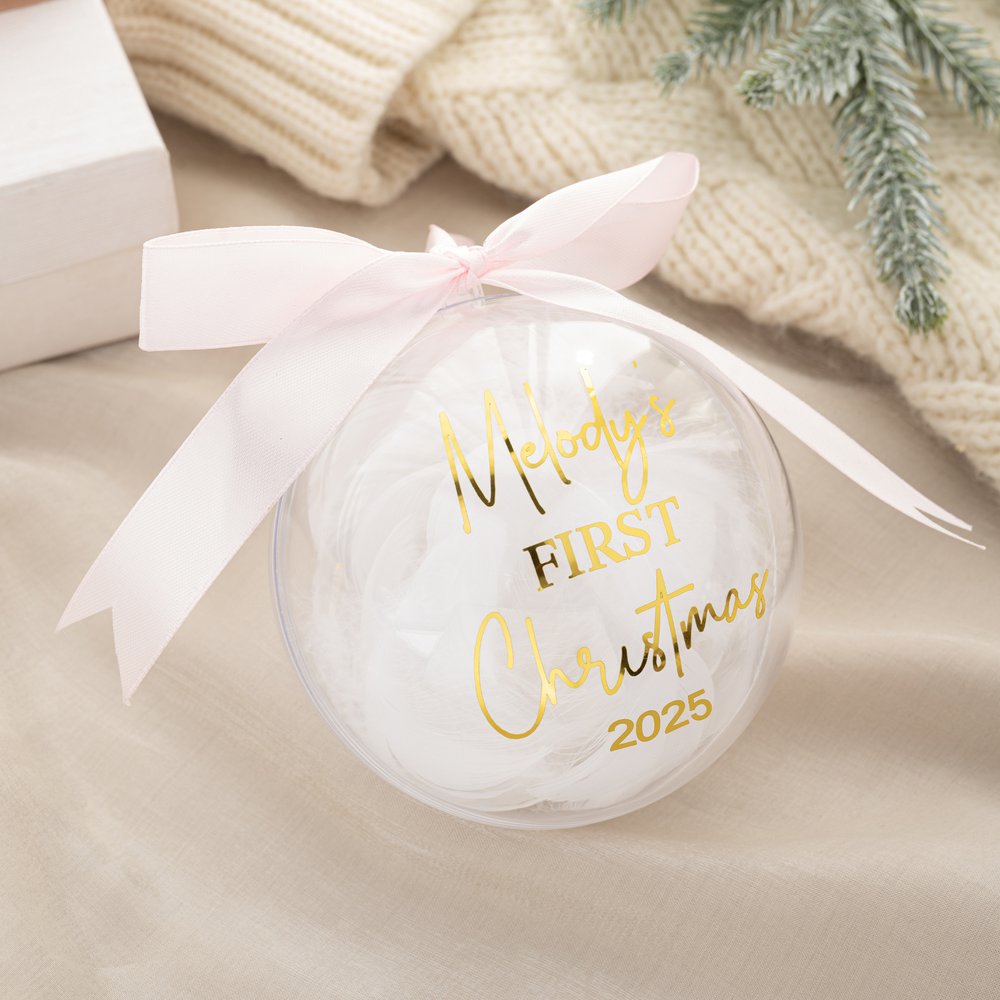 Fabriquées en plastique incassable, ces décorations sont durables et vous accompagneront pendant d'innombrables fêtes de Noël. Le corps transparent met parfaitement en valeur l'élégant remplissage de plumes, tandis que les rubans délicats ajoutent une touche de charme. Le processus de pelliculage professionnel garantit que votre personnalisation est durable et résistante aux rayures et à l'écaillage.