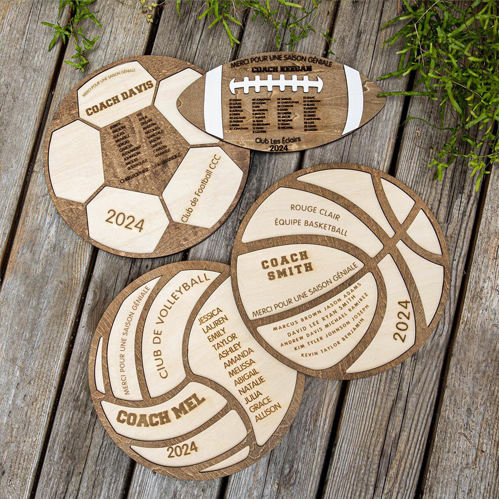 La plaque 3D en bois personnalisée d'une équipe sportive est une pièce faite à la main et significative. La couche supérieure de la plaque est fabriquée en bois de haute qualité et est disponible en options basket-ball, football, volley-ball et football américain. Elle est méticuleusement gravée du nom de l'entraîneur, du nom de l'équipe, du nom du joueur, de l'année et d'un message d'inspiration. La gravure est profonde et précise, ce qui donne un effet 3D époustouflant qui ne manquera pas d'impressionner.