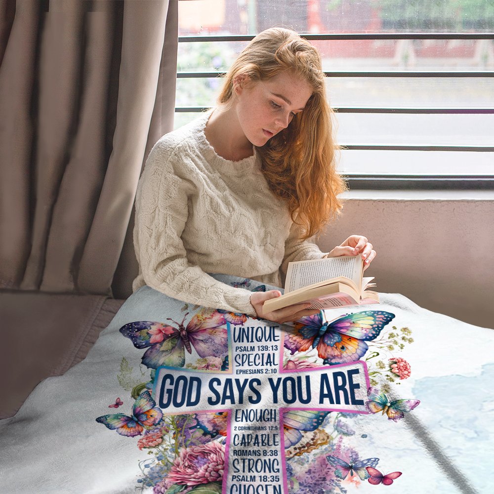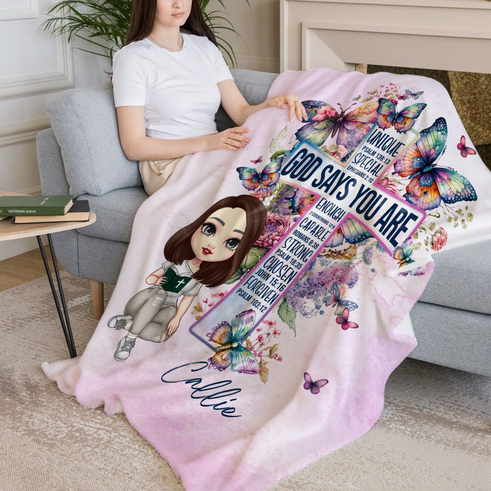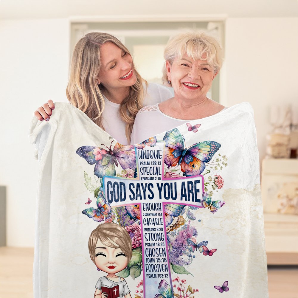 Cette couverture bien conçue associe des messages bibliques édifiants à de charmants personnages de dessins animés, créant ainsi un mélange unique d'inspiration et de chaleur. Le message central, "Dieu dit que vous êtes unique, spécial, capable, fort, choisi, pardonné", est un rappel quotidien de l'amour de Dieu et de la valeur personnelle. Chaque couverture est personnalisée avec le nom du destinataire, ce qui en fait un objet important qui relie la foi à l'identité individuelle.