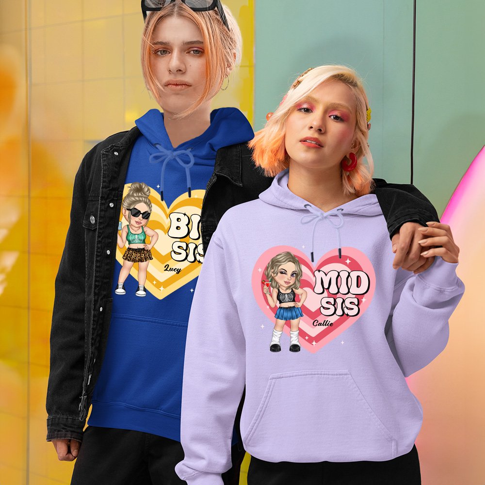 Ces vêtements présentent un design tendance inspiré du passage à l'an 2000, avec de jolies filles de bande dessinée en forme de cœur. Ce motif est non seulement accrocheur, mais aussi plein de personnalité. Que vous choisissiez un T-shirt, un sweat ou un sweat à capuche, vous vous démarquerez de la foule. La touche personnalisée avec les noms en fait un cadeau unique que vos amies chériront à jamais.