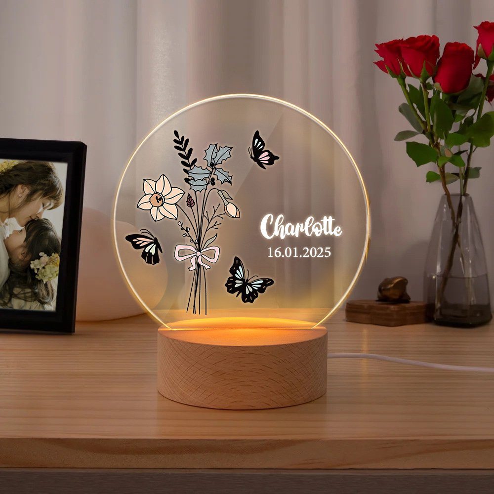 Cette veilleuse LED acrylique personnalisée en forme de fleur de naissance ajoute une touche de gaieté à votre décoration intérieure. Personnalisable avec le nom du destinataire, sa fleur de naissance et une date spéciale, elle se transforme en un cadeau unique rempli d'amour et de bons vœux, parfait pour toutes les occasions.