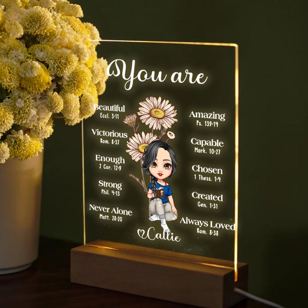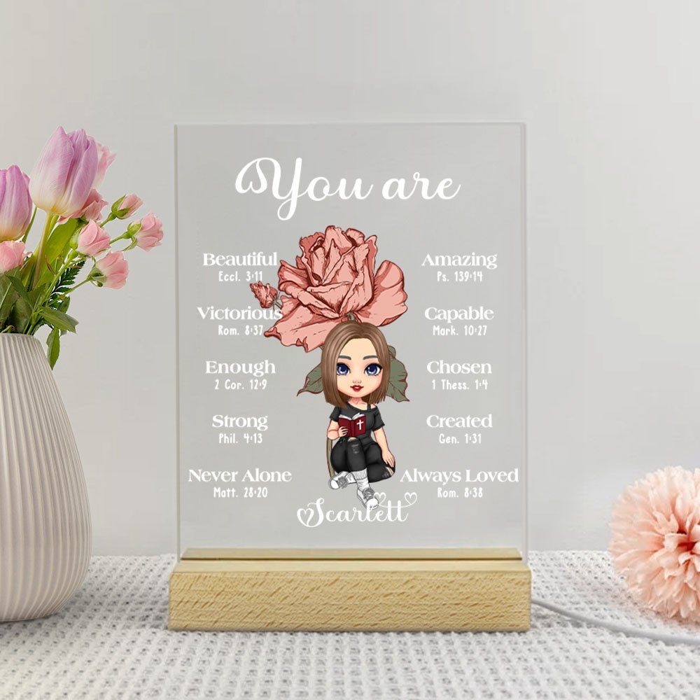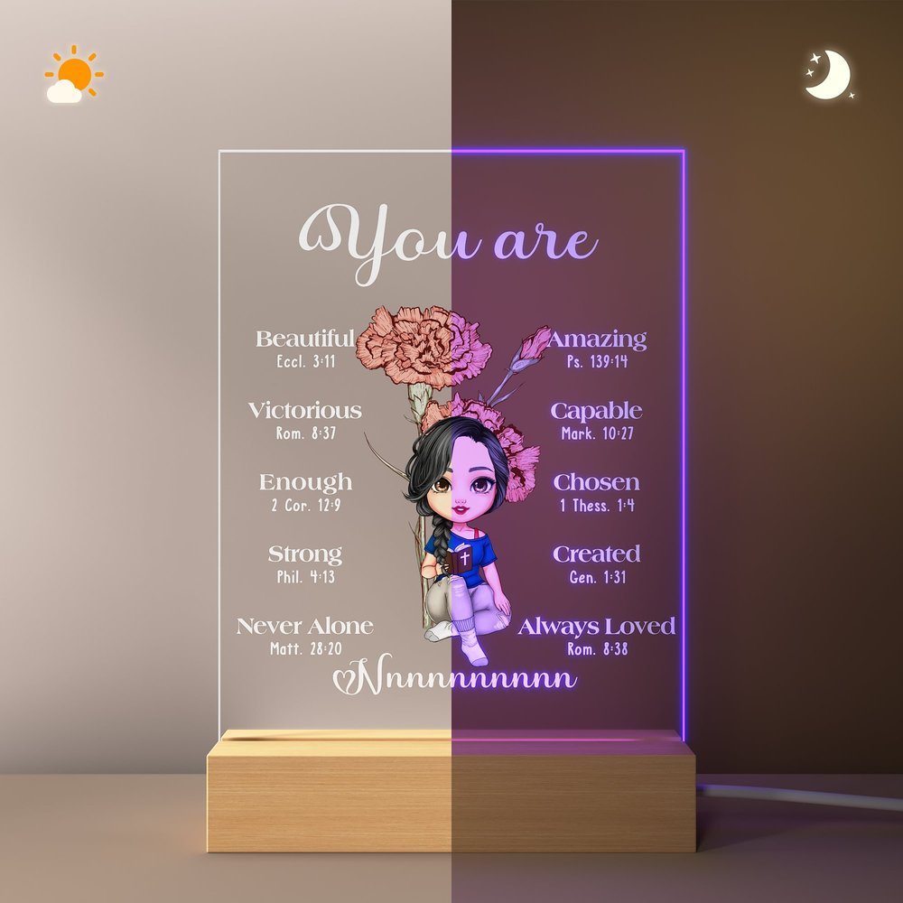 Avec des citations chrétiennes ou des versets bibliques édifiants, cette veilleuse est un rappel constant de la foi et de l'amour de Dieu. Les mots d'inspiration soigneusement choisis et l'élégant motif floral apportent réconfort et encouragement. C'est une belle façon d'intégrer la réflexion spirituelle dans la vie quotidienne, en rappelant doucement sa foi, même dans les moments calmes de la nuit.