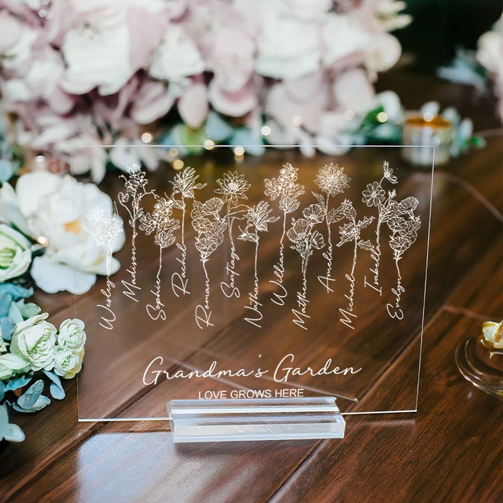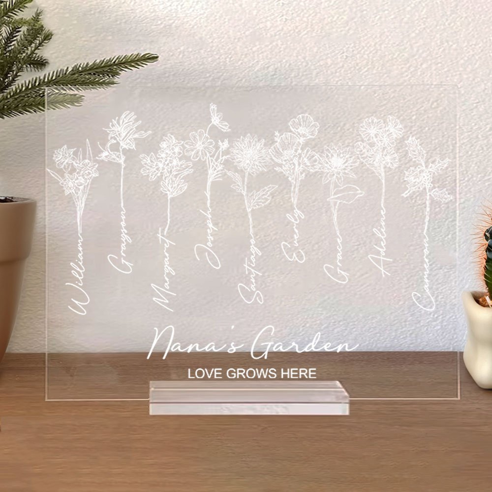Notre plaque personnalisée "Love Grows Here" avec fleur de naissance est un cadeau qui va droit au cœur pour les grands-mères ou les mères. Cette plaque peut être personnalisée avec leur nom et comporte un magnifique motif de fleur de naissance, symbolisant leur personnalité unique et leur amour nourricier. En outre, elle peut également être personnalisée avec la fleur de naissance et le nom d'un membre de la famille, reflétant ainsi le lien d'affection familial.