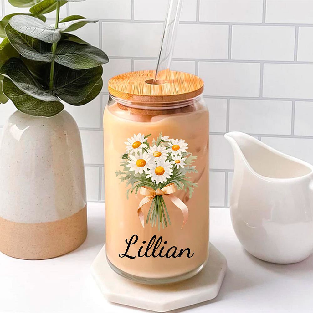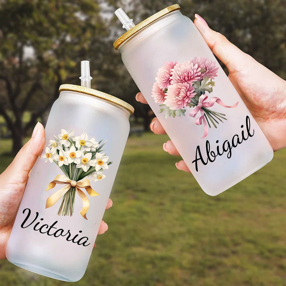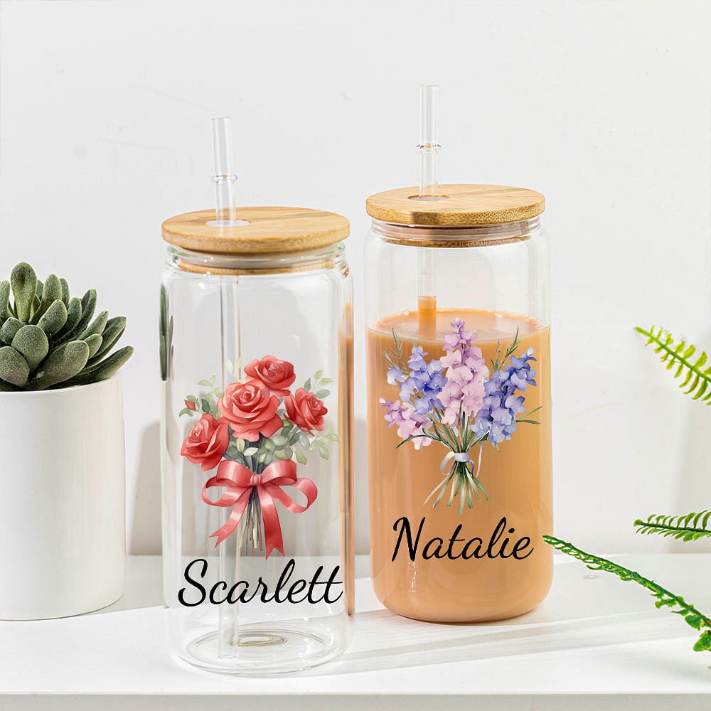 Ce gobelet en verre présente un motif unique de bouquet d'anniversaire, vous permettant de sélectionner des motifs basés sur les mois de naissance et de les personnaliser avec le nom du destinataire.