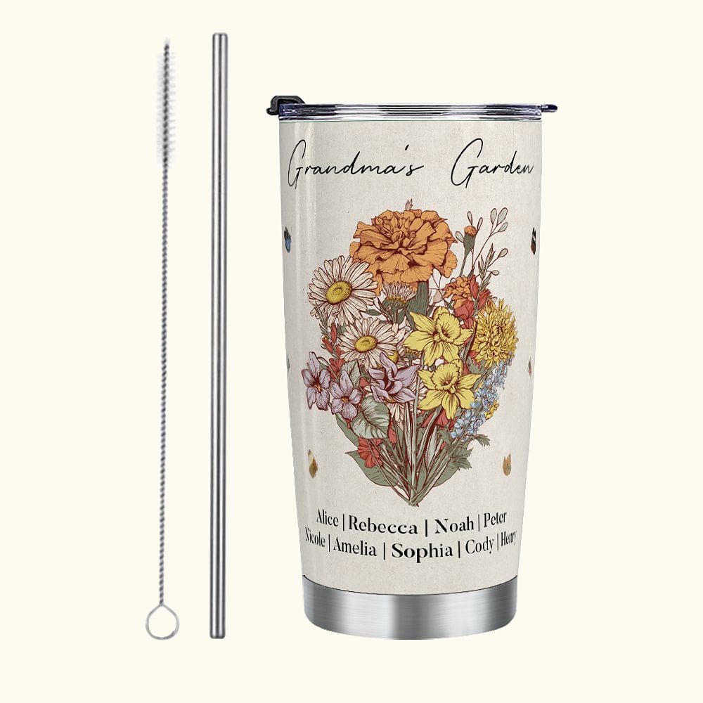 Ce gobelet présente un magnifique bouquet de fleurs de naissance. Chaque fleur représente le mois de naissance d'un enfant et peut être personnalisée avec son nom, créant ainsi un bouquet unique et significatif qui exprime l'amour et l'admiration pour les mères ou les grands-mères.