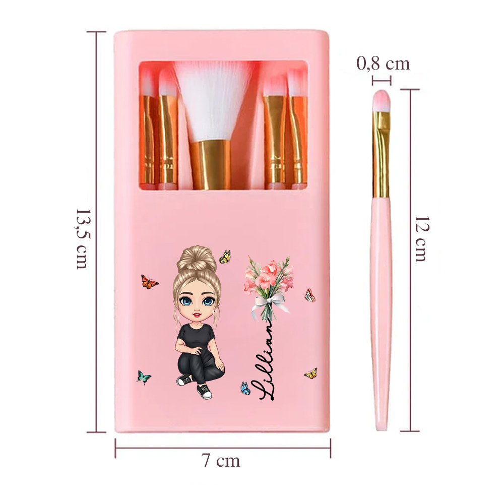 L'ensemble présente une belle combinaison de bouquets de fleurs de naissance et d'un adorable personnage de dessin animé, ce qui le différencie des ensembles de pinceaux de maquillage ordinaires. Le personnage de dessin animé sur la boîte de rangement de voyage est un ajout charmant. Le personnage est entouré de papillons et de fleurs, créant une atmosphère fantaisiste et féminine.