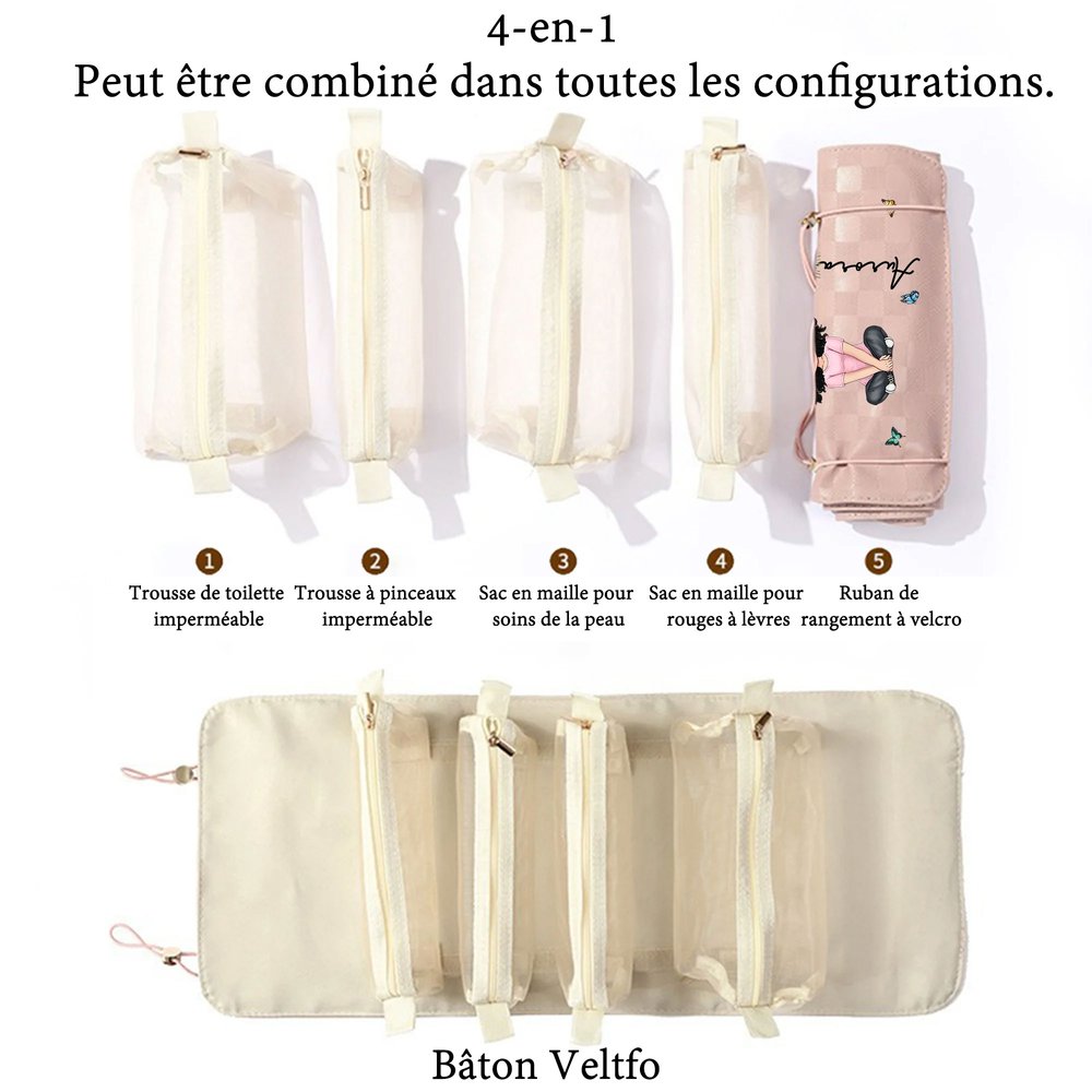 Utilisez-le pour ranger vos cosmétiques, vos produits de soin et vos articles de toilette à la maison, ou emportez-le en voyage comme organiseur compact tout-en-un. Le sac comporte plusieurs pochettes détachables (trousse de toilette étanche, trousse à pinceaux, trousse de soins de la peau, trousse de rouge à lèvres) qui peuvent être combinées à volonté, ce qui permet d'accéder rapidement aux articles. Le crochet intégré vous permet de l'accrocher n'importe où, pour gagner de la place dans les salles de bains des hôtels ou à la maison.